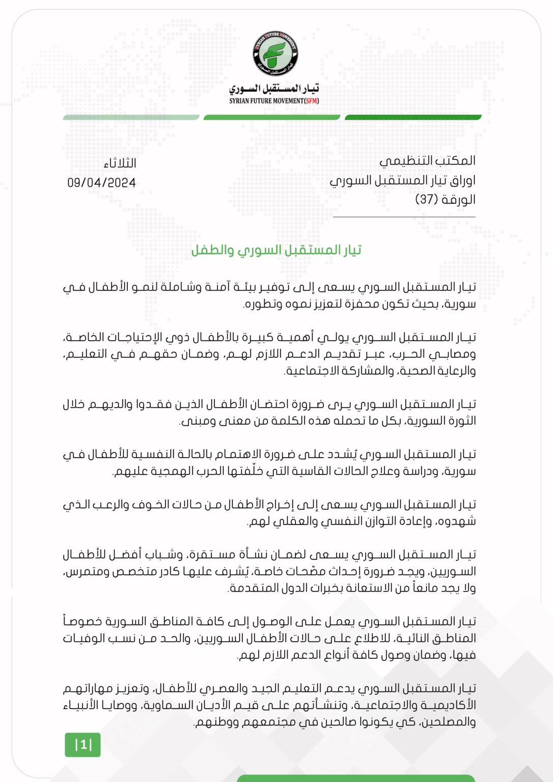 تيار المستقبل السوري يسعى للتعاون مع كافة مكونات الشعب السوري السياسية والحكومية والمدنية لتعزيز البيئات التمكينية للنماء في مرحلة الطفولة المبكرة خصوصاً، بما في ذلك سَن سياسات صديقة للأسرة بما يضمن سلامة الأطفال من كل النواحي.