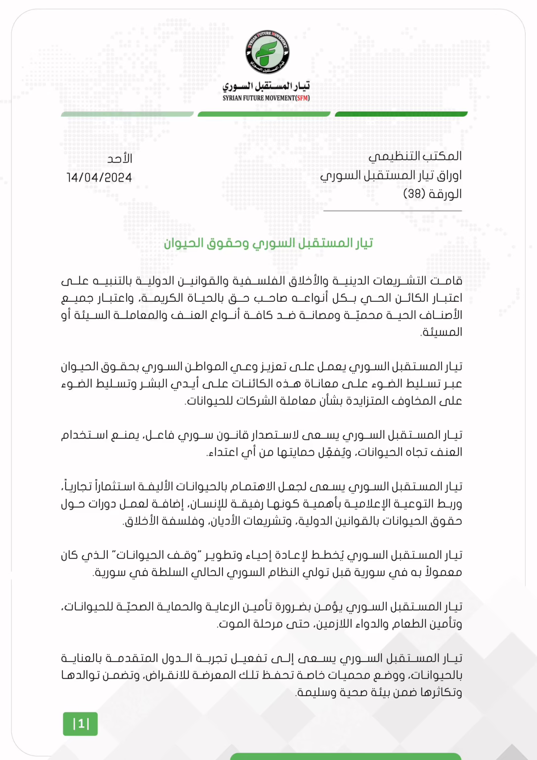 تيار المستقبل السوري يدعم حراك الناشطين المحليين والدوليين في مجال حقوق الحيوان، ونفتح لهم أبواب مقراتنا في الداخل السوري للتعاون نحو بناء واقع أفضل فيما خص حقوق الحيوانات.