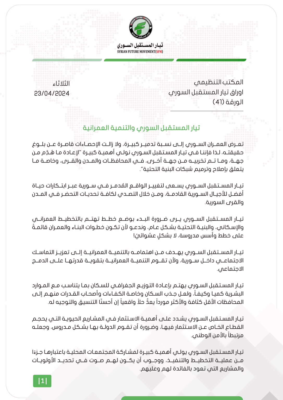 تيار المستقبل السوري يرى ضرورة التركيز على تحقيق العدالة الاجتماعية في عملية التنمية العمرانية.
