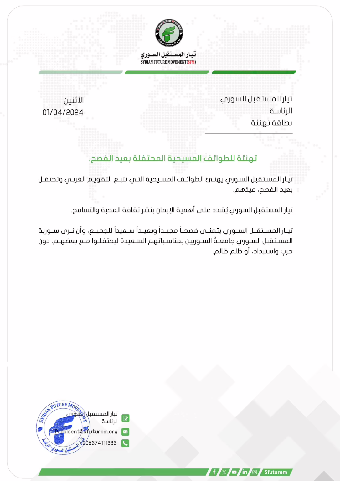 تيار المستقبل السوري يتمنى فصحاً مجيداً وبعيداً سعيداً للجميع، وأن نرى سورية المستقبل السوري جامعةً السوريين بمناسباتهم السعيدة ليحتفلوا مع بعضهم، دون حربٍ واستبداد، أو ظلم ظالم.
