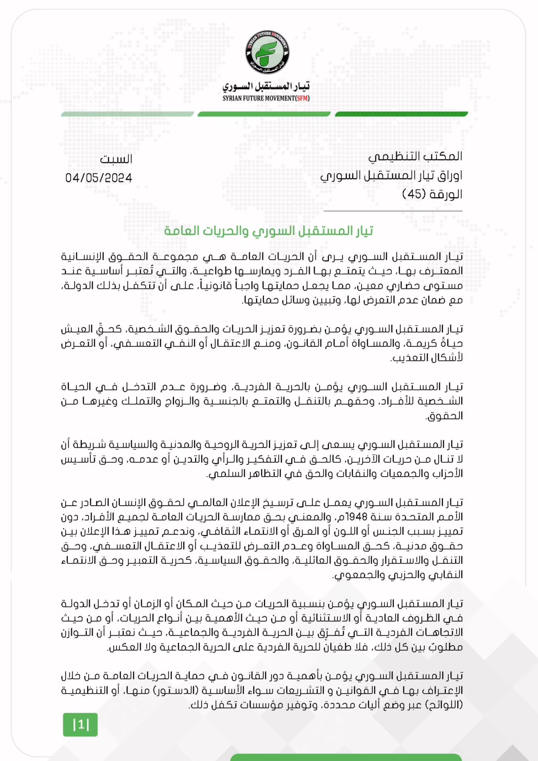 تيار المستقبل السوري يُشدد على ضرورة إيلاء الخصوصية السورية بالحريات العامة أهمية خاصة.
