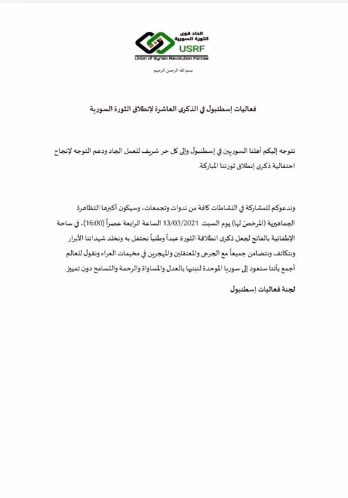 أدعو أحبابنا وإخواننا من السُّوريين الأحرار وكلَّ حرِّ شريف (يدعمُ قضيةَ شعبنا السوري المضطهد من نظام القتل والتشريد والتجويع) للمشاركة الجماهيريّة ( المرخَّص لها قانونياً ) يوم السبت القادم إن شاء الله. – نشر بتاريخ 10-3-2021