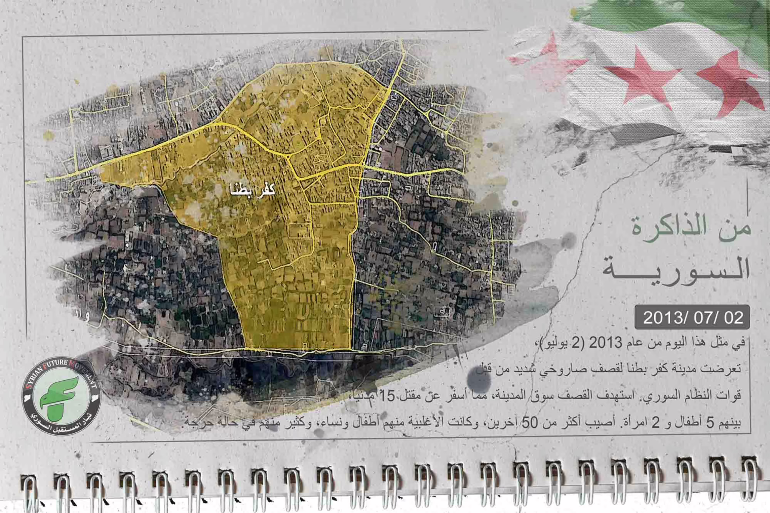 حدث في مثل هذا اليوم من عام 2013م: أن تعرضت مدينة كفر بطنا في صباح يوم الثلاثاء بتاريخ 2/ تموز/ 2013 لقصف صاروخي مكثف من قبل قوات النظام السوري, حيث تم استهداف سوق المدينة، الذي أدى إلى سقوط 15 شهيداً من أهالي المدينة بينهم 5 أطفال وسيدتان، إضافة إلى ما لايقل عن 50 جريحاً، معظمهم من الأطفال والنساء، غالبيتهم في حالة خطرة.