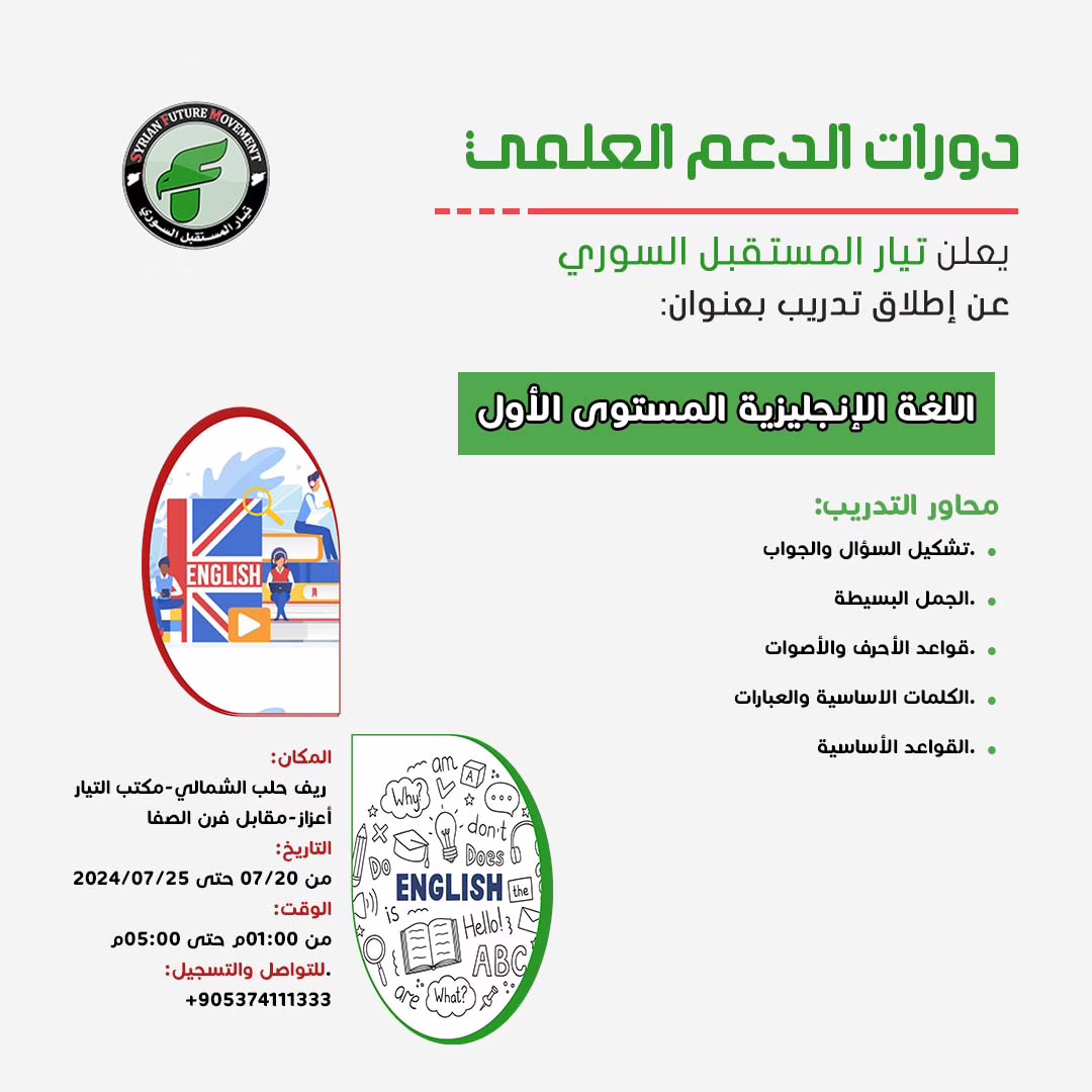 يعلن تيار المستقبل السوري عن اطلاق "تدريب اللغة الإنجليزية المستوى الأوّل" بهدف مساعدة المهتمين و الطلاب الجامعيين على إحاطتهم بمهارات اللغة الإنجليزية في منظمات العمل الإنساني، ومساعدتهم لاجتياز امتحاناتهم بنجاح.