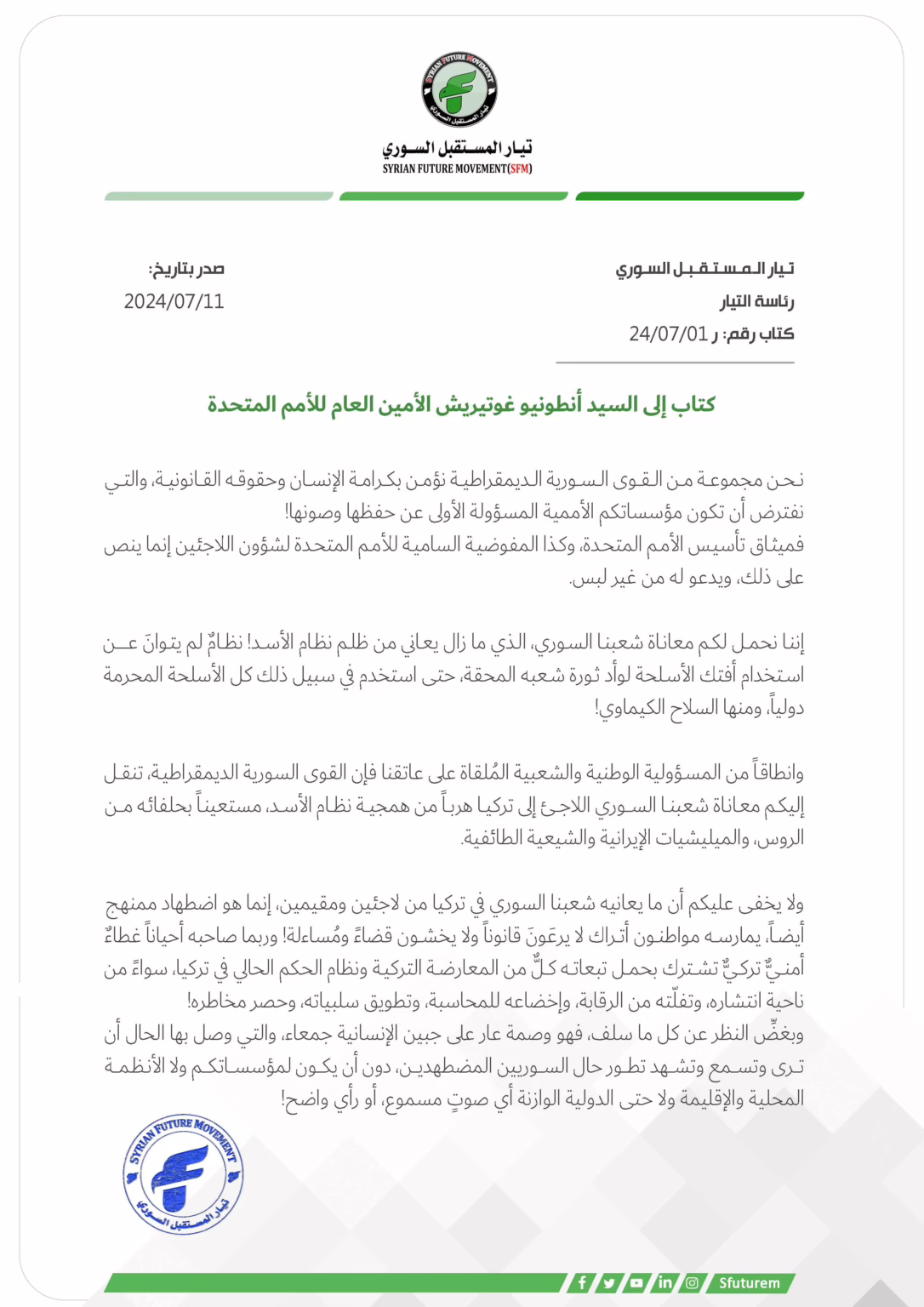 إننا نطلب من مقامكم، مساعدة شعبنا في الظرف الاستثنائي الذي يمر به، وأن يكون لكم موقف مشرّف بالضغط على جميع الدول خصوصاً تركيا ولبنان، البلدان الجارين لسورية، واللذين يُضيّقان الخناق على تواجد السوريين على أراضيهم، ويعملون على ترحيلهم قسرياً، قبل الوصول لحل مستدام، وتسوية صحيّةٍ وشاملة.