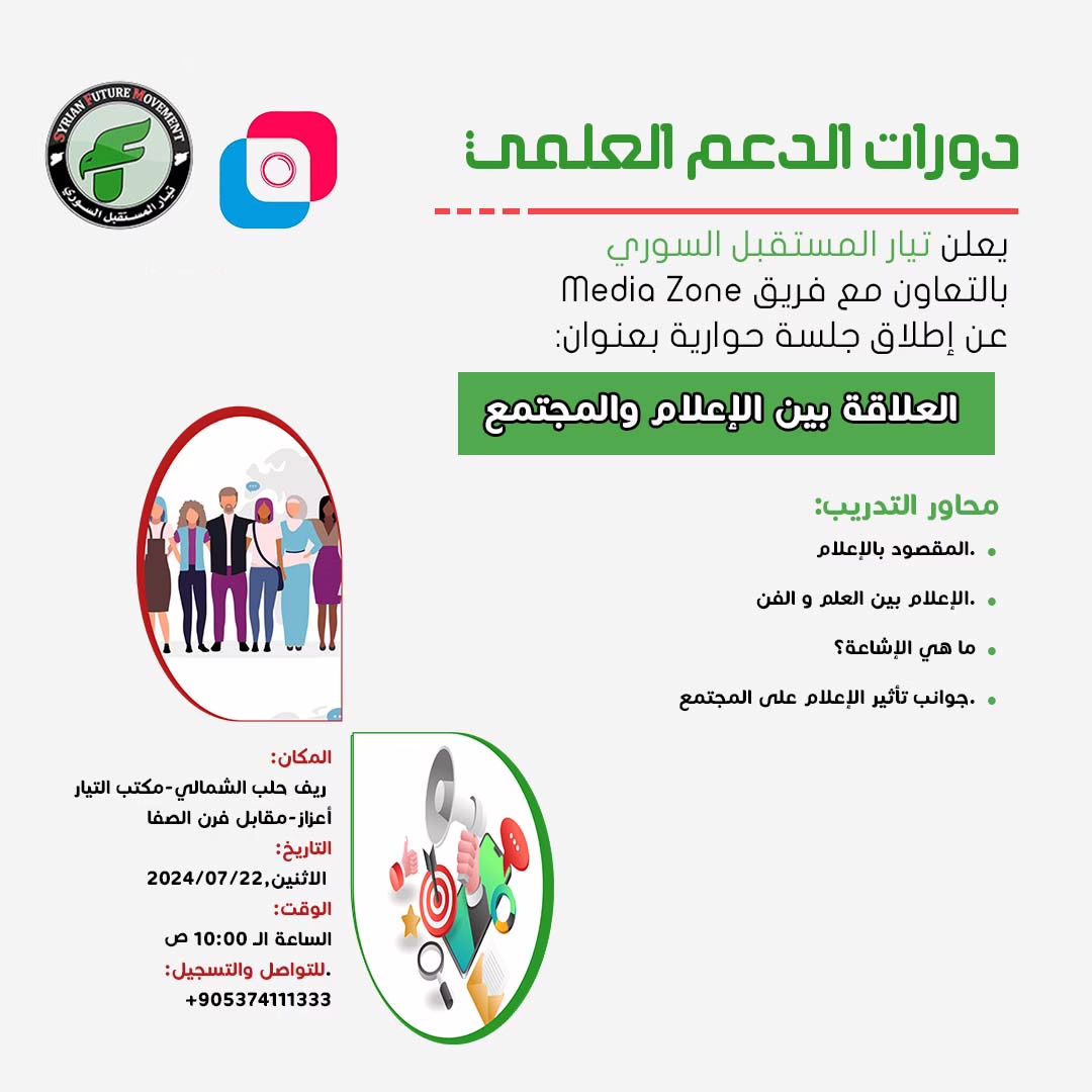بالتعاون بين تيار المستقبل السوري وفريق Media Zone ستُطلق جلسة حوارية بعنوان ( العلاقة بين الإعلام والمجتمع ) وفق المحاور التالية: