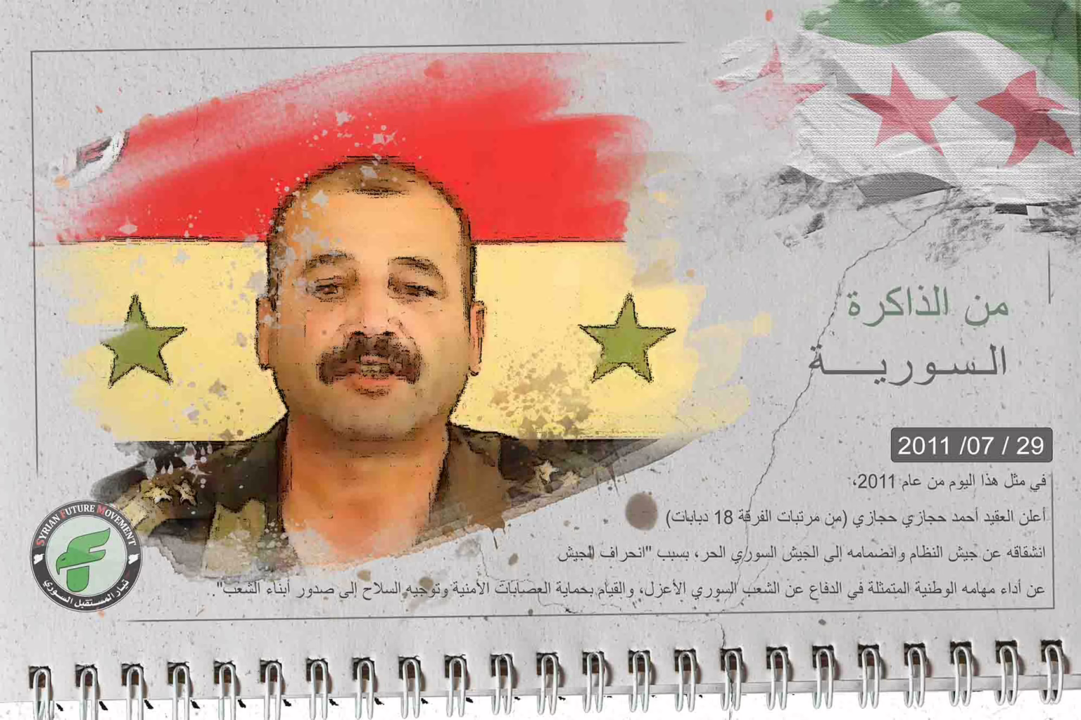 في مثل هذا اليوم من عام 2011، أعلن العقيد أحمد حجازي حجازي (من مرتبات الفرقة 18 دبابات) انشقاقه عن جيش النظام وانضمامه إلى الجيش السوري الحر، بسبب "انحراف الجيش عن أداء مهامه الوطنية المتمثلة في الدفاع عن الشعب السوري الأعزل، والقيام بحماية العصابات الأمنية وتوجيه السلاح إلى صدور أبناء الشعب".