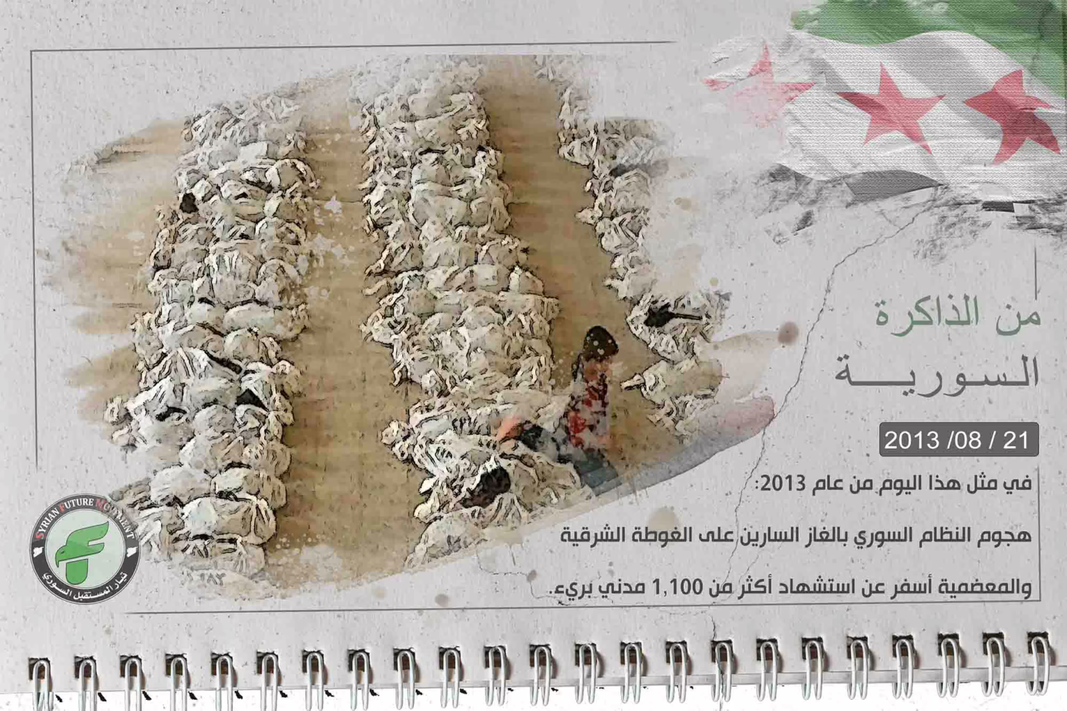 في مثل هذا اليوم من عام 2013: أطلق النظام السوري صواريخ محملة بغاز الأعصاب الكيماوي، على مناطق في الغوطة الشرقية، والمعضمية بالغوضة الغربية، حيث استشهد أكثر من 1100 سورياً مدنياً بريئاً.