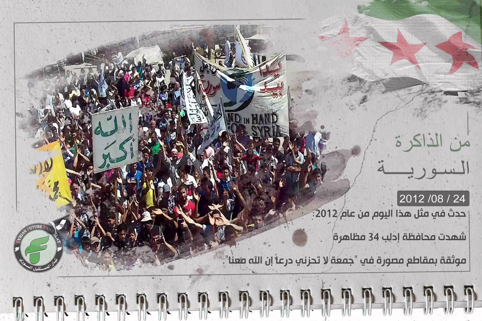 حدث في مثل هذا اليوم من عام 2012: شهدت محافظة إدلب 34 مظاهرة موثقة بمقاطع مصورة في "جمعة لا تحزني درعا إن الله معنا".