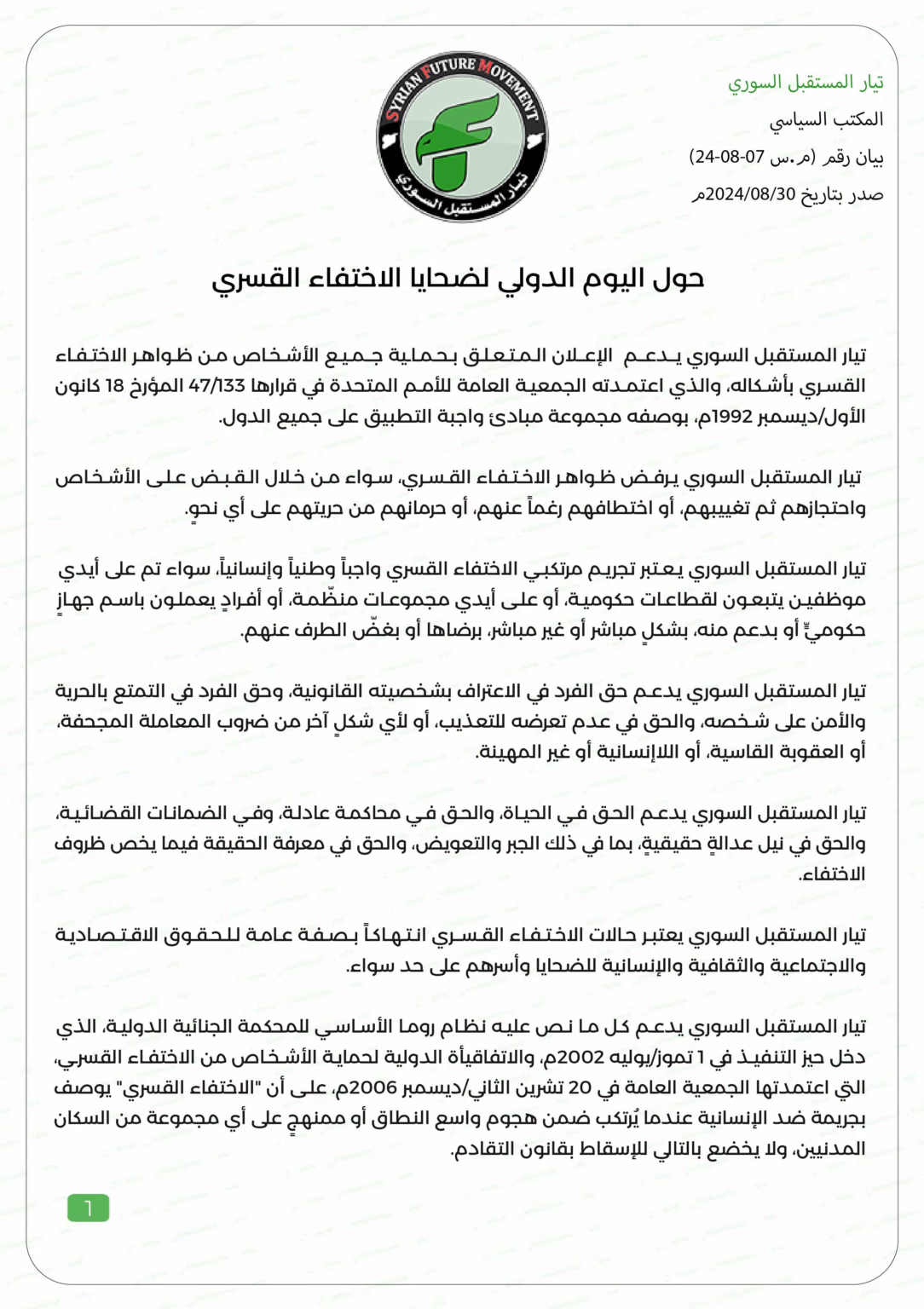 تيار المستقبل السوري يدعم الإعلان المتعلق بحماية جميع الأشخاص من ظواهر الاختفاء القسري بأشكاله، والذي اعتمدته الجمعية العامة للأمم المتحدة في قرارها 133/47 المؤرخ 18 كانون الأول/ديسمبر 1992م، بوصفه مجموعة مبادئ واجبة التطبيق على جميع الدول.