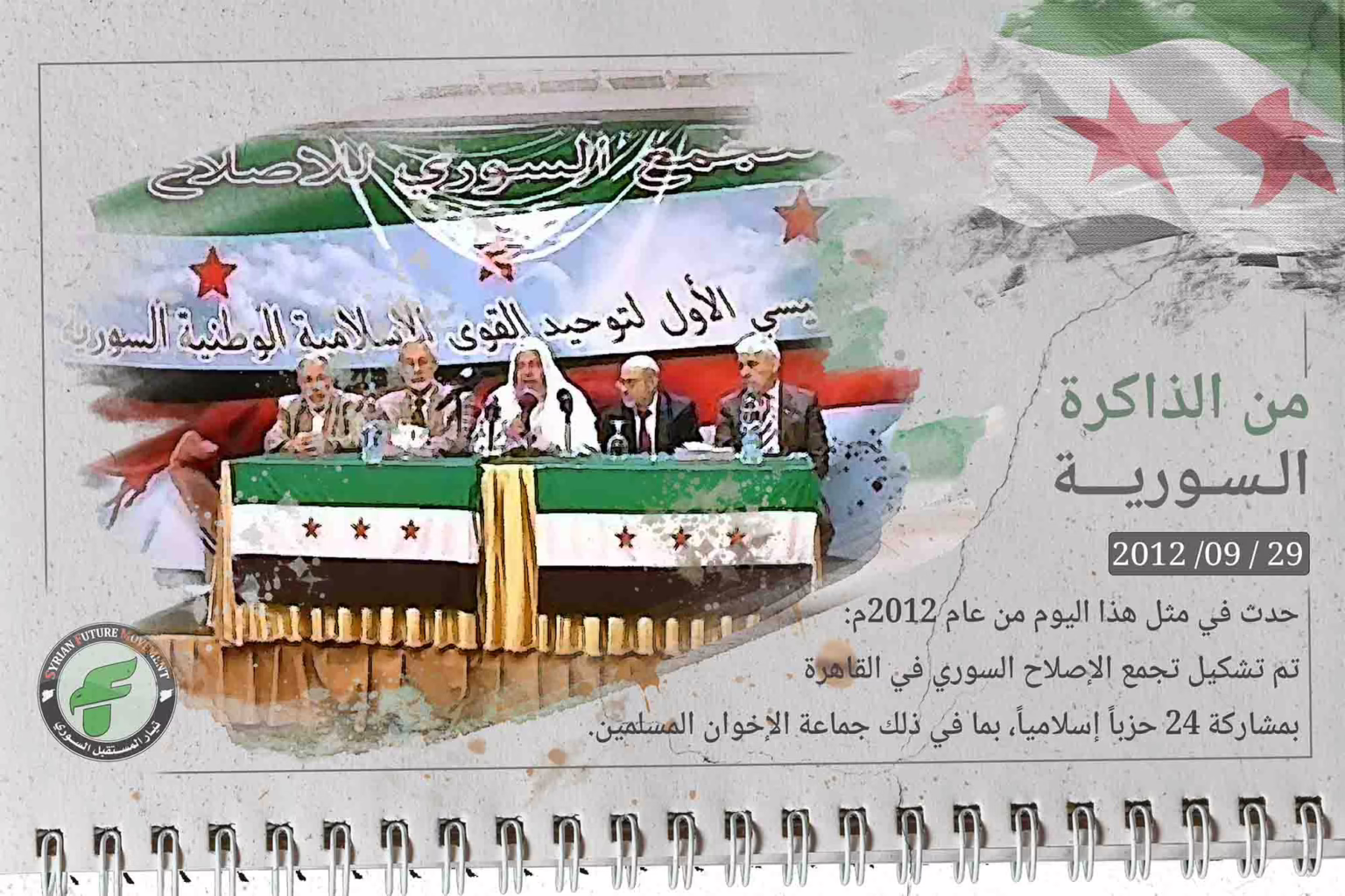 حدث في مثل هذا اليوم عام 2012م: أعلن في القاهرة تأسيس التجمع السوري للإصلاح بمشاركة 24 حزبًا وحركة إسلامية سورية، أبرزها رابطة العلماء المسلمين، وجماعة الإخوان المسلمين، والتيار الوطني الديمقراطي، وجماعة العلماء السوريين الأحرار.