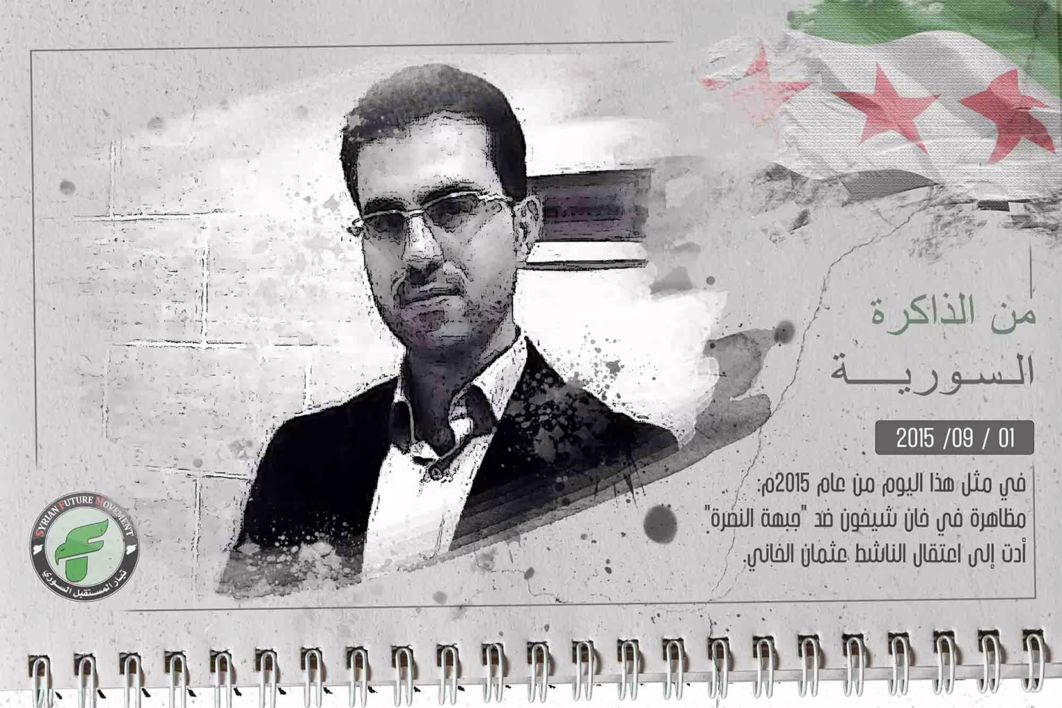 حدث في مثل هذا اليوم من عام 2015م: خروج مظاهرة في مدينة خان شيخون طالبت بخروج "جبهة النصرة" من المنطقة، حيث اعتقلت "النصرة" مدير المركز الإعلامي في مدينة خان شيخون الناشط عثمان الخاني على إثر المظاهرة.