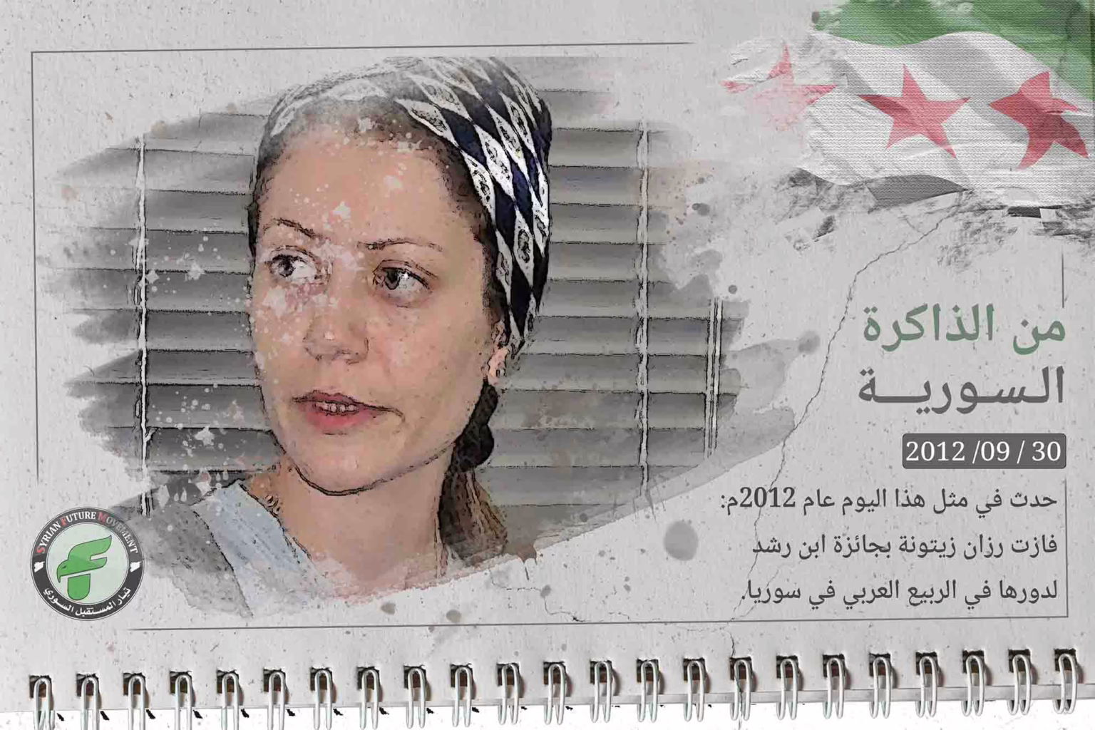 حدث في مثل هذا اليوم عام 2012م: أعلنت مؤسسة "ابن رشد للفكر الحر" فوز الناشطة السورية رزان زيتونة بجائزتها السنوية المخصصة لنشطاء الربيع العربي. وأشارت المؤسسة إلى أن زيتونة تمثل نموذجًا للشباب السوري الذي يخاطر بحريته وحياته لتحقيق التغيير والانتقال إلى دولة مدنية ديمقراطية، كما أنها مثال للنساء السوريات اللواتي يشاركن في النضال ضد نظام الاستبداد.