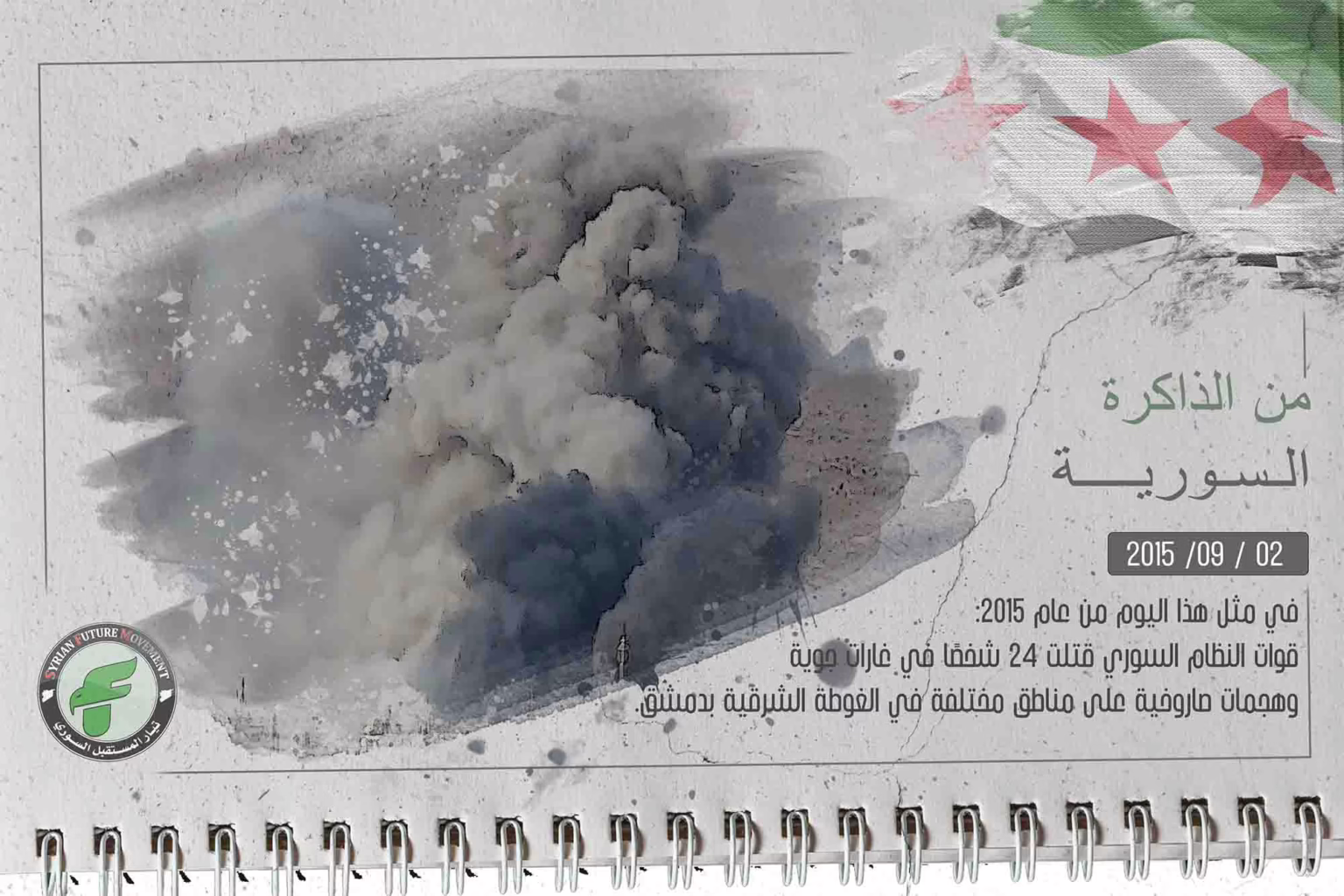حدث في مثل هذا اليوم من عام 2015م: مجزرتان في دوما ومضايا, قصفت قوات النظام السوري بالطيران الحربي وصواريخ أرض أرض عدة مناطق في الغوطة الشرقية بريف دمشق، ما أسفر عن مقتل 12 شخصًا في مدينة دوما، بحسب "تنسيقية دوما"، 5 في بلدتي سقبا وجسرين، 3 أشخاص في بلدة حمورية، وشخصين في بلدة زبدين، بحسب المرصد السوري لحقوق الإنسان.