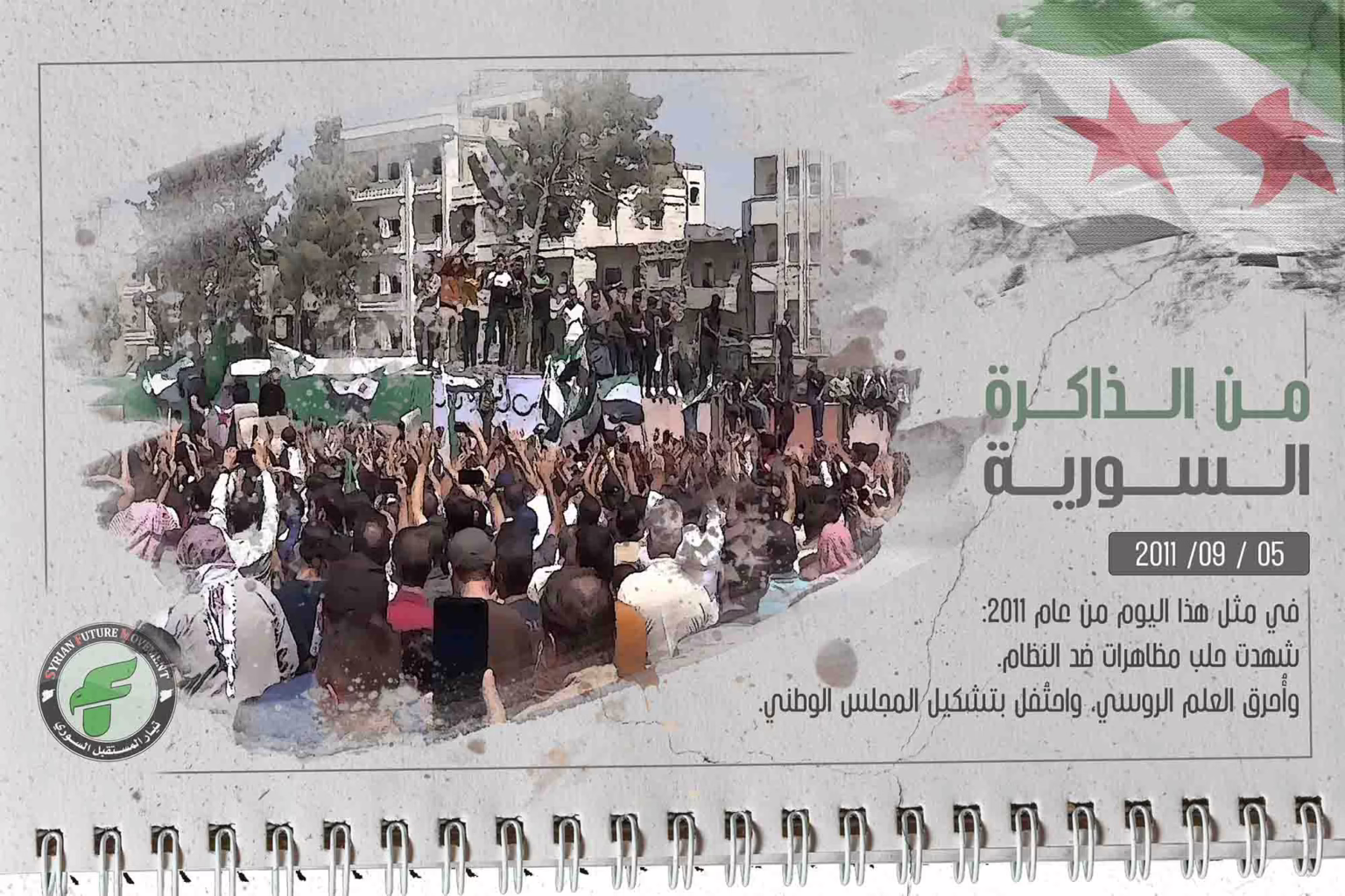 حدث في مثل هذا اليوم من عام 2011م: شهدت حلب مظاهرات في الصاخور والمرجة والشيخ مقصود، وخرجت مظاهرات في الباب وإعزاز. هتف المتظاهرون ضد النظام وأحرقوا العلم الروسي، ورفعوا لافتة تهنئ بتشكيل المجلس الوطني.