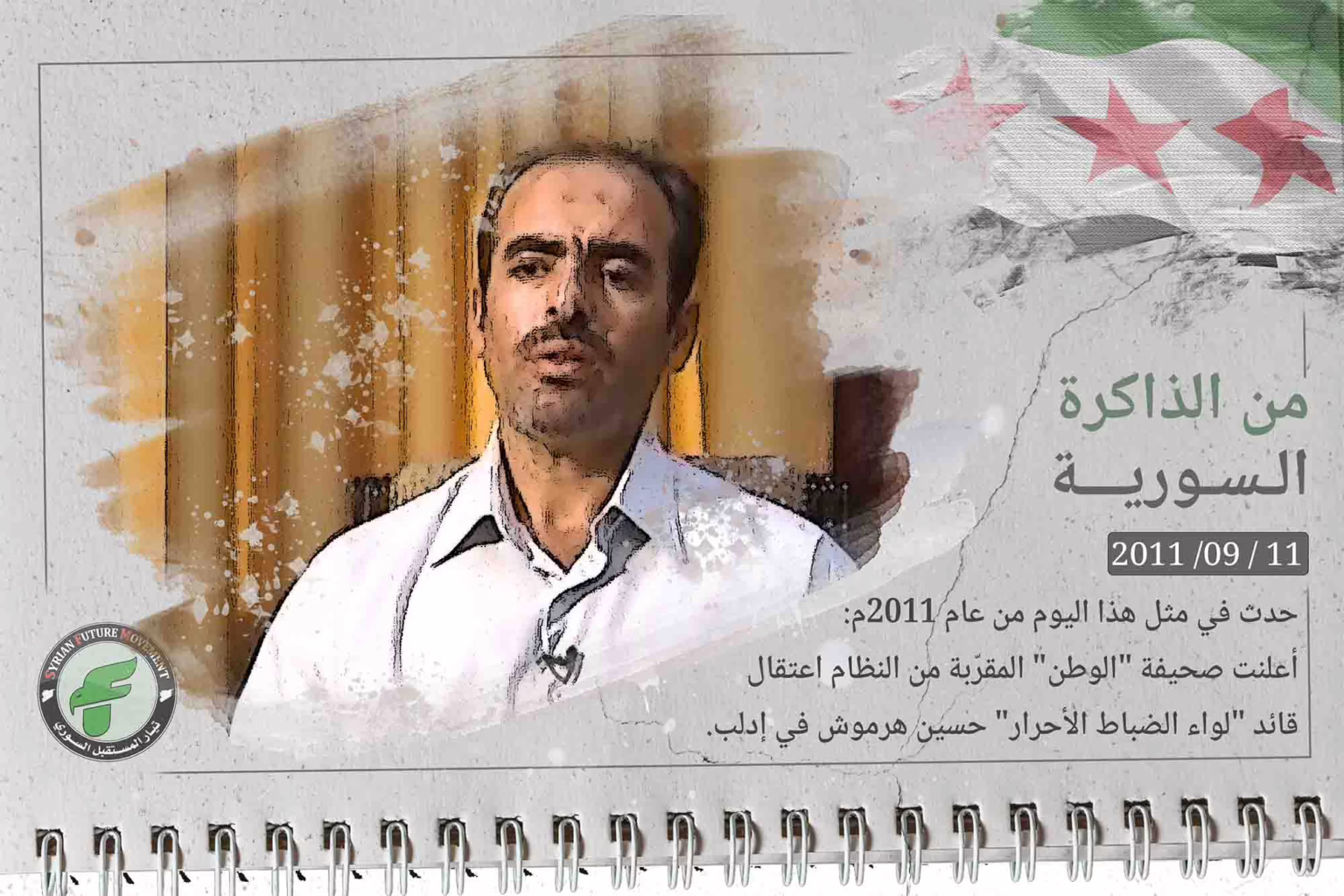 حدث في مثل هذا اليوم من عام 2011م: أعلنت صحيفة "الوطن" المقربة من النظام نقلًا عن "مصادر أهلية في محافظة إدلب" اعتقال مؤسس وقائد "لواء الضباط الأحرار" المقدم حسين هرموش، وقالت الصحيفة إن "هرموش كان يتنقل منذ فترة بين سورية وتركيا وتم إلقاء القبض عليه نهاية الأسبوع الماضي في قريته إبلين وكان برفقة عدد من المطلوبين للعدالة"، وأضافت أن "عملية نوعية قامت بها القوات الأمنية في القرية المذكورة وتم إلقاء القبض على هرموش حيًا بحوزته أسلحة متوسطة وخفيفة وأجهزة اتصالات وحواسب ".