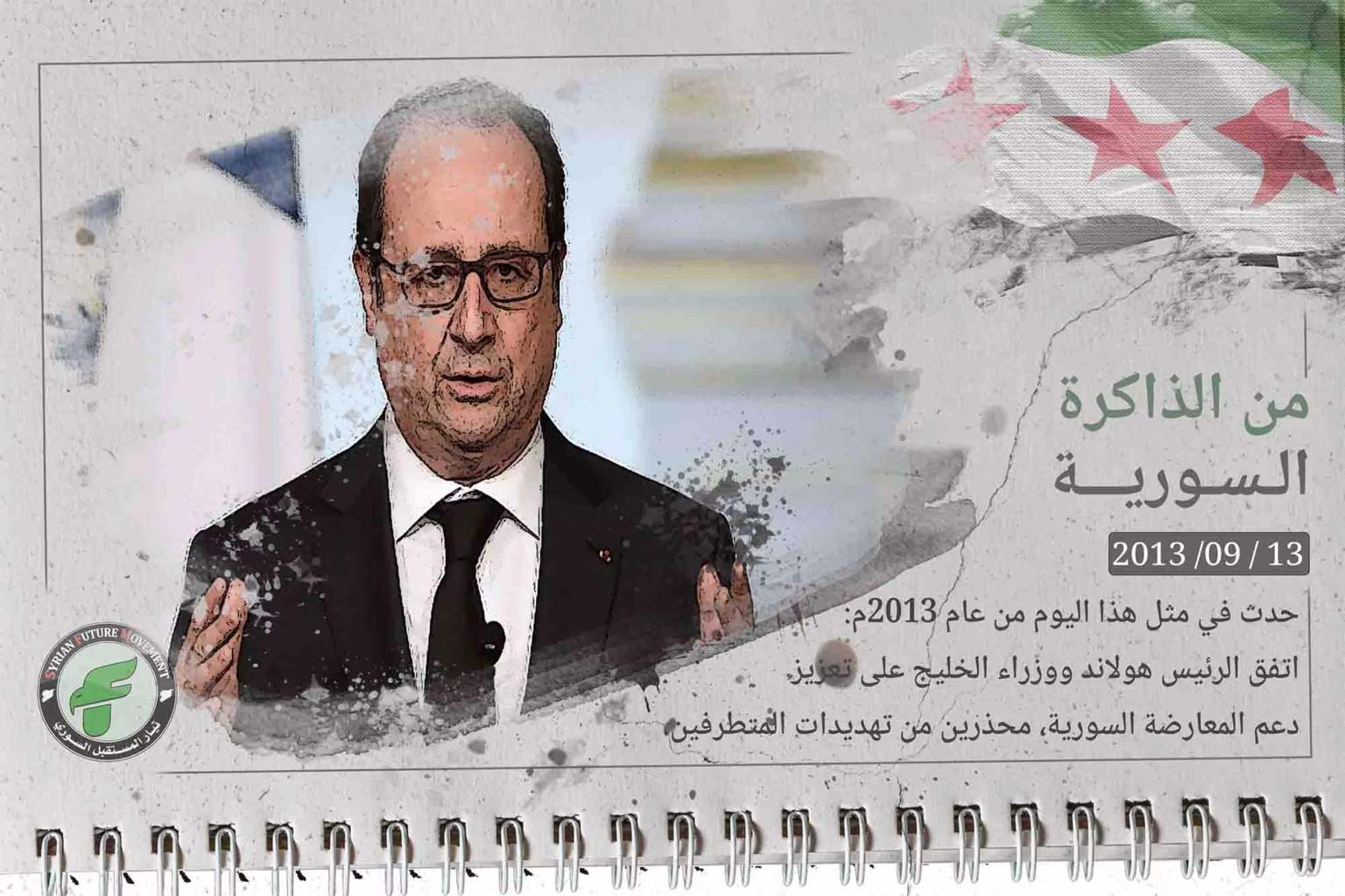 حدث في مثل هذا اليوم من عام 2013م: اجتمع الرئيس الفرنسي فرانسوا هولاند في باريس مع وزير الخارجية السعودي الأمير سعود الفيصل والإماراتي عبد الله بن زايد والأردني ناصر جودة، وأعلنت الرئاسة الفرنسية أن الرئيس والوزراء "توافقوا على ضرورة تعزيز الدعم الدولي للمعارضة الديمقراطية" في سورية "للسماح لها بمواجهة هجمات النظام"، وأضافت الرئاسة أن "تعنت" النظام السوري "يصب في مصلحة الحركات المتطرفة ويهدد الأمن الإقليمي والدولي".