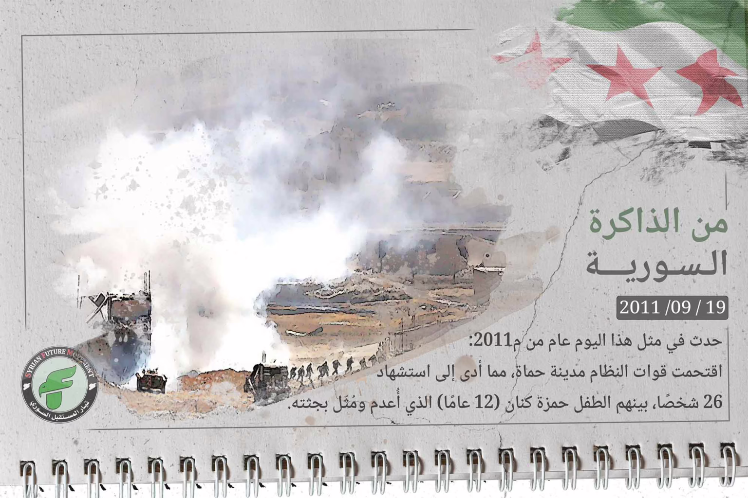 حدث في مثل هذا اليوم عام 2011م: اقتحمت قوات النظام حيي الأربعين ومشاع الأربعين في حماة بعد قصف مدفعي، ما أدى إلى استشهاد 26 شخصًا، بينهم الطفل حمزة كنان (12 عامًا) الذي أُعدم ومثّل بجثته.