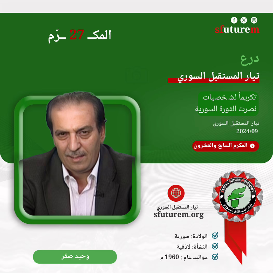 إننا في تيار المستقبل السوري، ولأجل تاريخه النضالي والسياسي والوطني الحافل والغني، ولوقوفه مع أبناء شعبه في ثورتهم ضد الظلم والطغيان، وعرفاناً منّا بالجميل لقامات سورية ورجالاتها العظماء، فإننا نقدّم درع تيار المستقبل السوري هذا الأسبوع لـِ صقر المعارضة السورية، “وحيد صقر” درعاً سوريّاً رمزيَّاً يحمل رؤيتنا ومنهجنا الوطنيَّ الجامع.