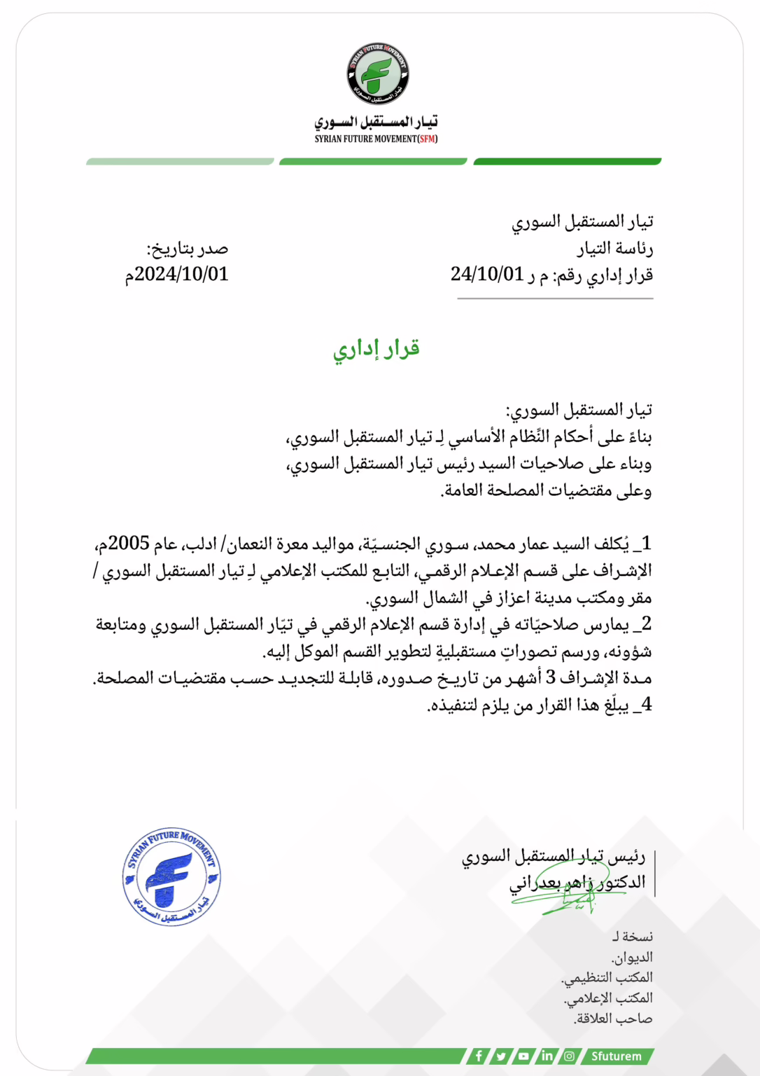 - يُكلف السيد عمار محمد، سوري الجنسيّة، مواليد معرة النعمان/ ادلب، عام 2005م، الإشراف على قسم الإعلام الرقمي، التابع للمكتب الإعلامي لـِ تيار المستقبل السوري / مقر ومكتب مدينة اعزاز في الشمال السوري.