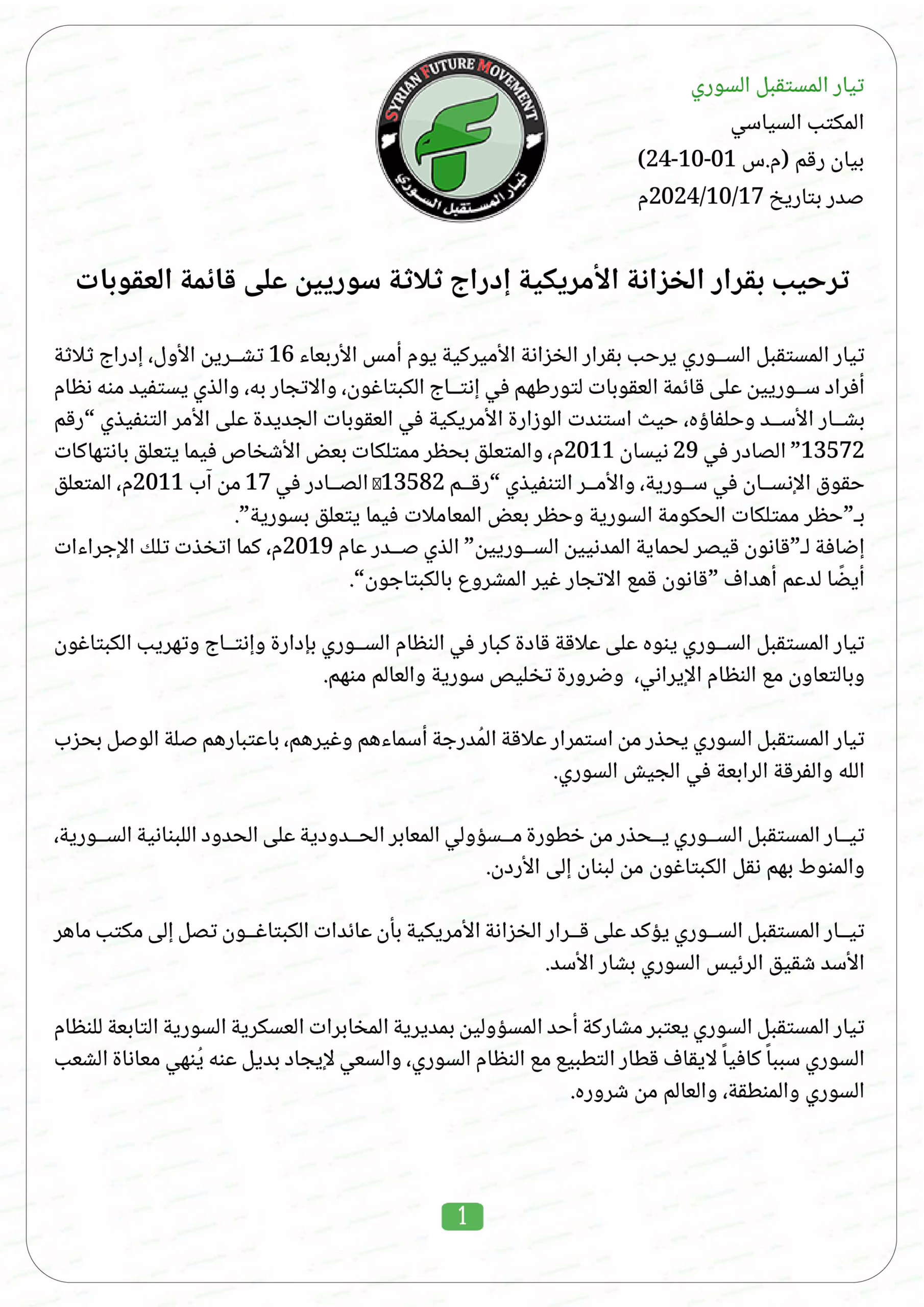 تيار المستقبل السوري يرحب بقرار الخزانة الأميركية يوم أمس الأربعاء 16 تشرين الأول، إدراج ثلاثة أفراد سوريين على قائمة العقوبات لتورطهم في إنتاج الكبتاغون، والاتجار به، والذي يستفيد منه نظام بشار الأسد وحلفاؤه، حيث استندت الوزارة الأمريكية في العقوبات الجديدة على الأمر التنفيذي “رقم 13572” الصادر في 29 نيسان 2011م، والمتعلق بحظر ممتلكات بعض الأشخاص فيما يتعلق بانتهاكات حقوق الإنسان في سورية، والأمر التنفيذي “رقم 13582″ الصادر في 17 من آب 2011م، المتعلق بـ”حظر ممتلكات الحكومة السورية وحظر بعض المعاملات فيما يتعلق بسورية”.