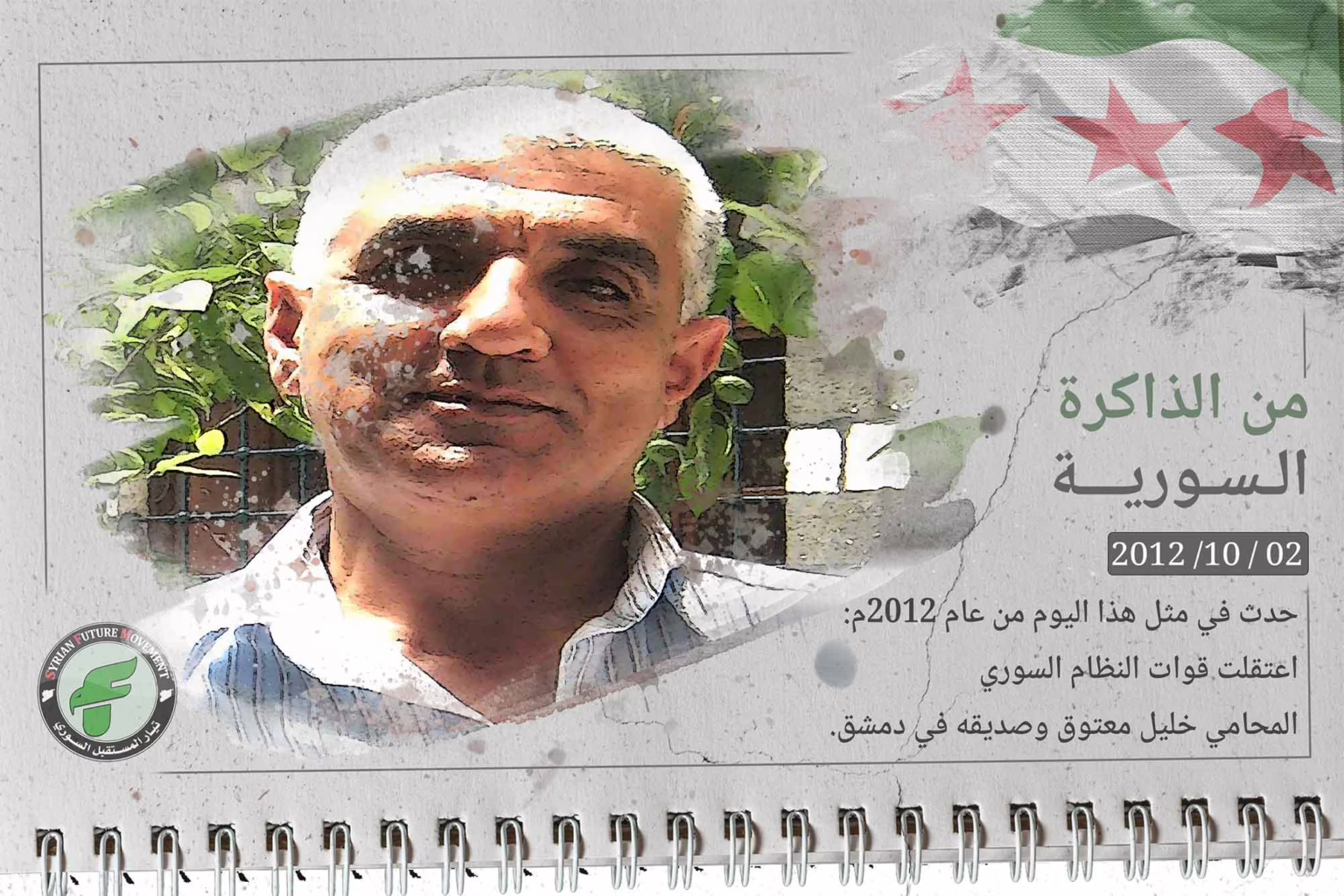 حدث في مثل هذا اليوم من عام 2012م: اعتقلت قوات النظام السوري المحامي خليل معتوق، وهو المدير التنفيذي للمركز السوري للدراسات والأبحاث القانونية، برفقة صديقه محمد ظاظا، خلال ذهابهما من منزل معتوق في بلدة صحنايا (ريف دمشق) إلى مكتبه وسط مدينة دمشق.