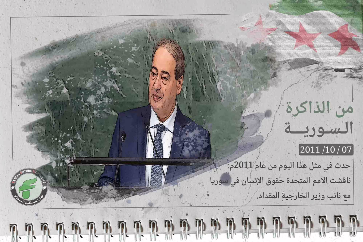 حدث في مثل هذا اليوم من عام 2011م: عقد مجلس حقوق الإنسان التابع للأمم المتحدة جلسة لمناقشة تقرير الاستعراض الدوري الشامل لأوضاع حقوق الإنسان في سورية، بحضور وفد من حكومة النظام السورية برئاسة نائب وزير الخارجية والمغتربين فيصل المقداد.