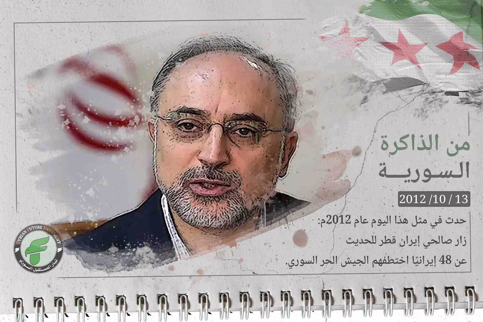 حدث في مثل هذا اليوم من عام 2012م: زيارة وزير الخارجية علي أكبر صالحي إلى قطر لبحث مصير 48 إيرانيًا اختطفهم الجيش الحر في سورية، تقول إيران إنهم كانوا يقومون بزيارة دينية، بينما يقول الجيش الحر إنهم أفراد في الحرس الثوري الإيراني، أرسلوا لمساعدة قوات النظام السوري.
