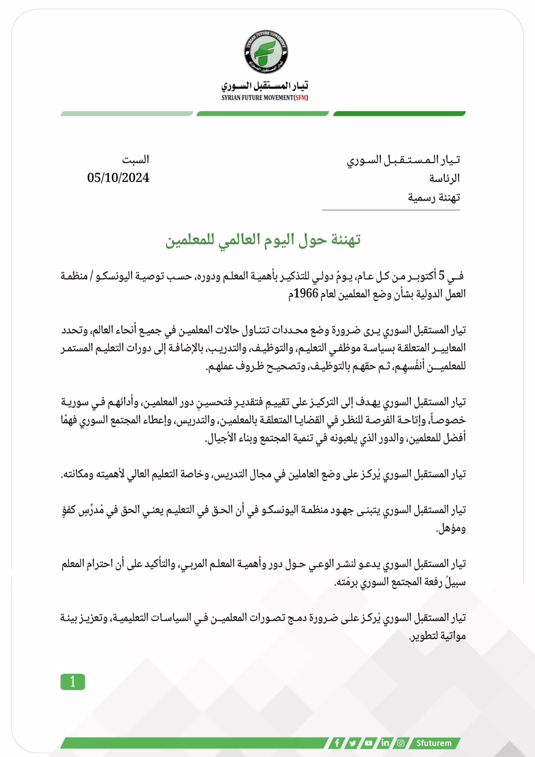 تيار المستقبل السوري يدعو لنشر الوعي حول دور وأهمية المعلم المربي، والتأكيد على أن احترام المعلم سبيلُ رفعة المجتمع السوري برمّته.