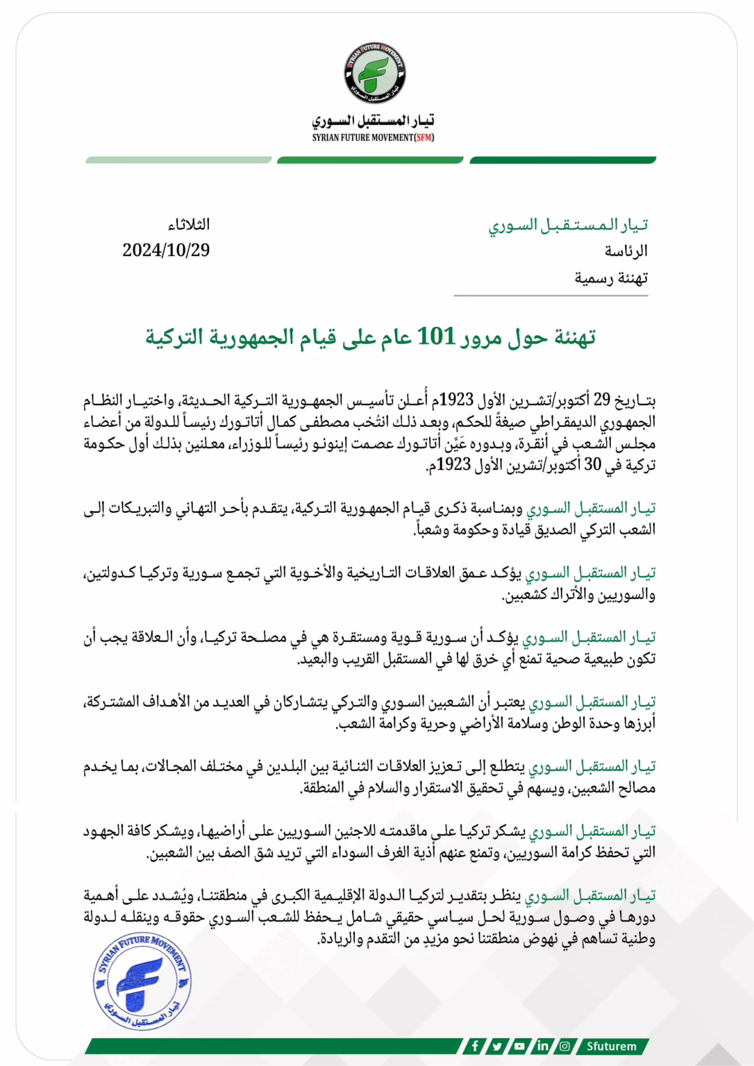 تيار المستقبل السوري وبمناسبة ذكرى قيام الجمهورية التركية، يتقدم بأحر التهاني والتبريكات إلى الشعب التركي الصديق قيادة وحكومة وشعباً.