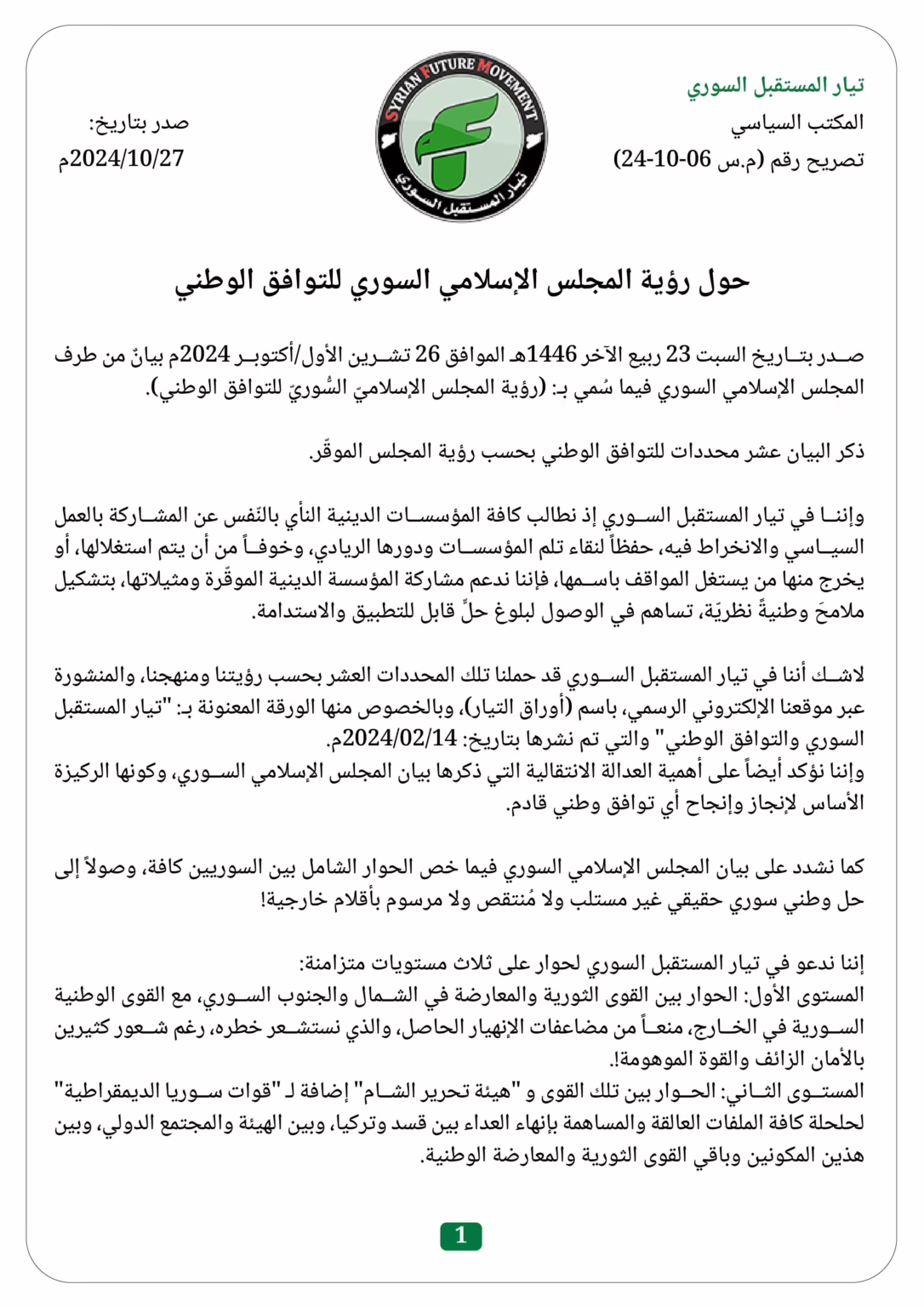 صدر بتاريخ السبت 23 ربيع الآخر 1446هـ الموافق 26 تشرين الأول/أكتوبر 2024م بيانٌ من طرف المجلس الإسلامي السوري فيما سُمي بـ: (رؤية المجلس الإسلاميّ السُّوريّ للتوافق الوطني).
