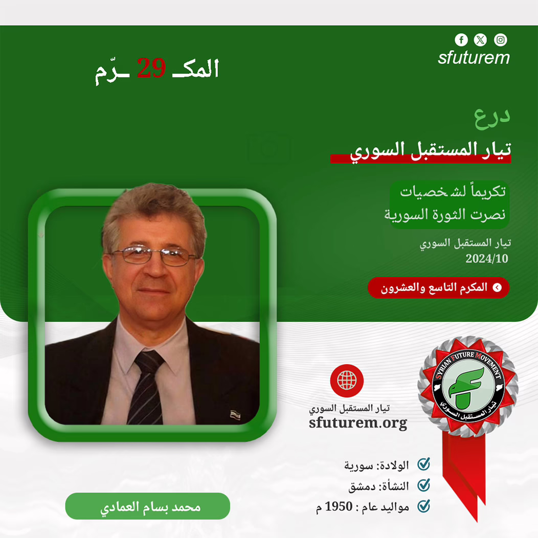 إننا في تيار المستقبل السوري، ولأجل تاريخه الديبلوماسي وثم الثوري، ولوقوفه مع أبناء شعبه في ثورتهم ضد الظلم والطغيان، وعرفاناً منّا بالجميل لقامات سورية ورجالاتها العظماء، فإننا نقدّم درع تيار المستقبل السوري هذا الأسبوع لـِ الدبلوماسي السوري السفير محمد بسام عمادي، درعاً سوريّاً رمزيَّاً، يحمل رؤيتنا ومنهجنا الوطنيَّ الجامع.