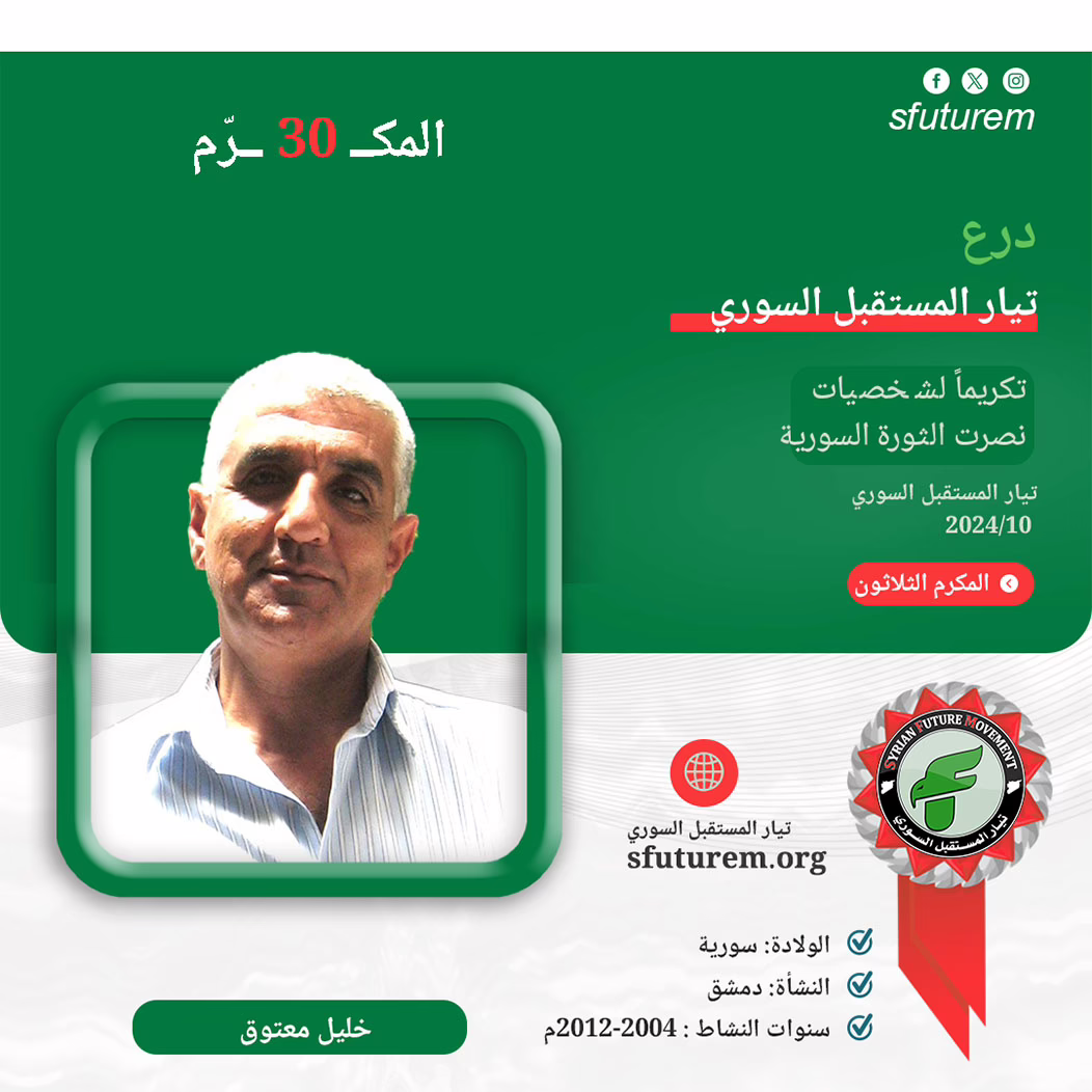 إننا في تيار المستقبل السوري، ولأجل تاريخه النضالي والسياسي والوطني الحافل والغني، ولوقوفه مع أبناء شعبه قبل وبعد ثورتهم ضد الظلم والطغيان، وعرفاناً منّا بالجميل لقامات سورية ورجالاتها العظماء، فإننا نقدّم درع تيار المستقبل السوري هذا الأسبوع لـِ المحامي الإنساني الوطني “خليل معتوق” درعاً سوريّاً رمزيَّاً يحمل رؤيتنا ومنهجنا الوطنيَّ الجامع، متمنين أن نراه بيننا قريبا بخير وعافية كما ستكون سورية.