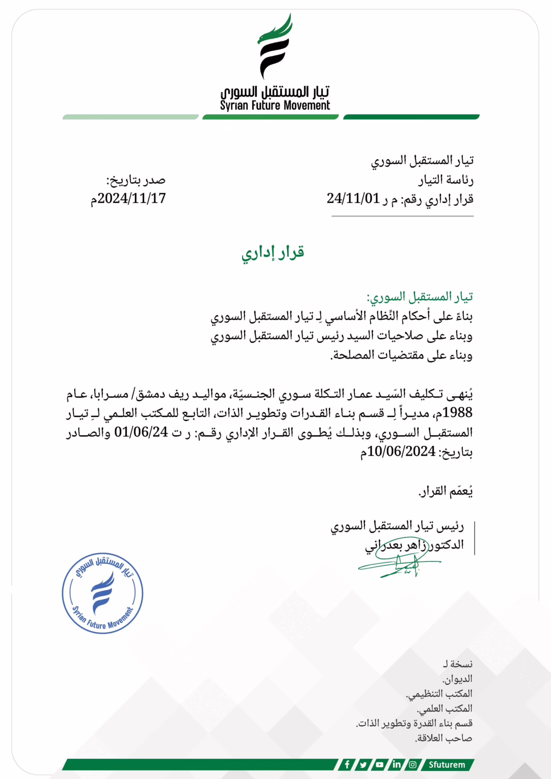 وبناء على صلاحيات السيد رئيس تيار المستقبل السوري