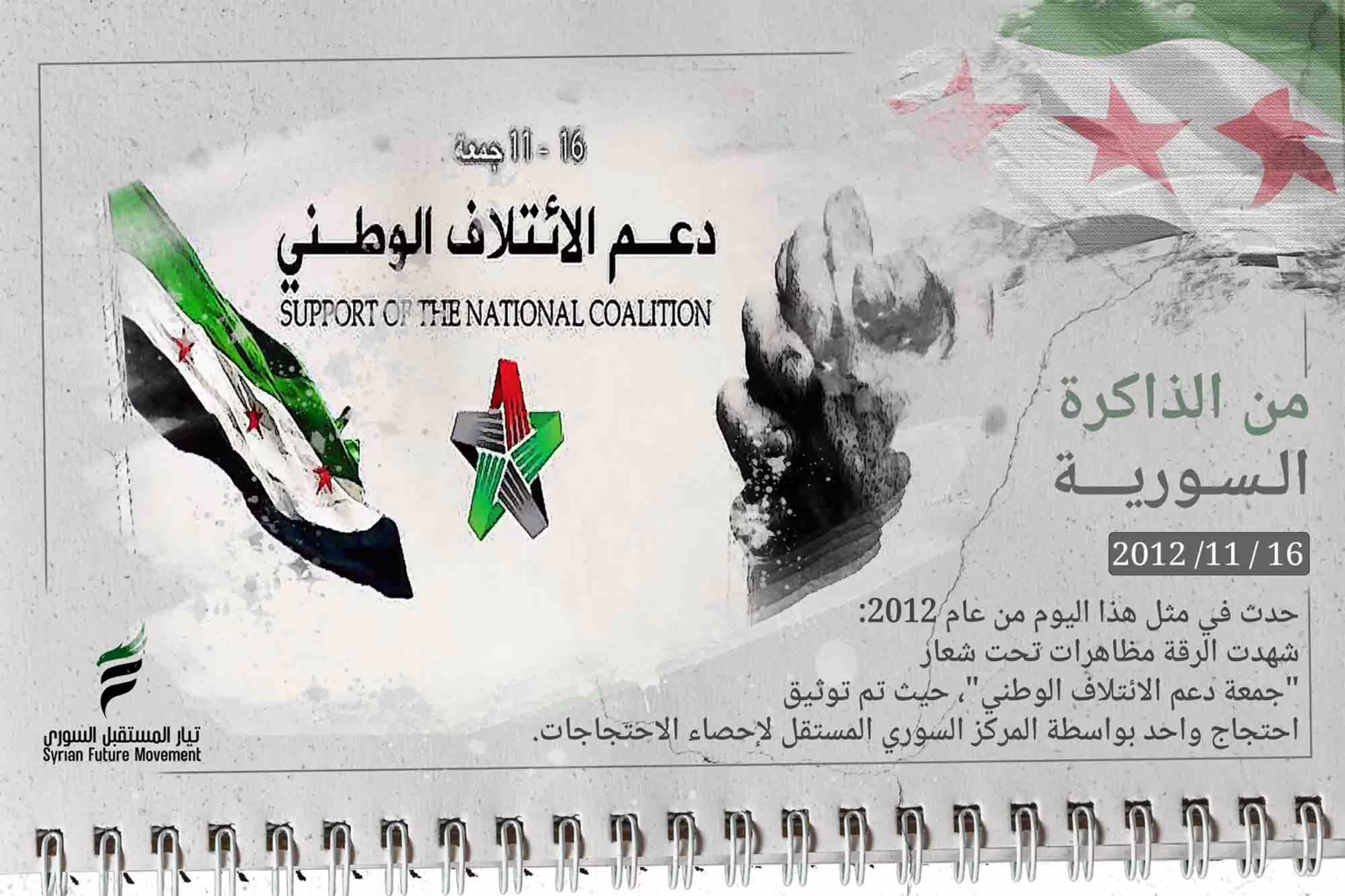 حدث في مثل هذا اليوم من عام 2012م: شهدت محافظة الرقة مظاهرات في "جمعة دعم الائتلاف الوطني"، وأحصى المركز السوري المستقل لإحصاء الاحتجاجات مظاهرة واحدة موثقة بمقاطع مصورة في المحافظة.