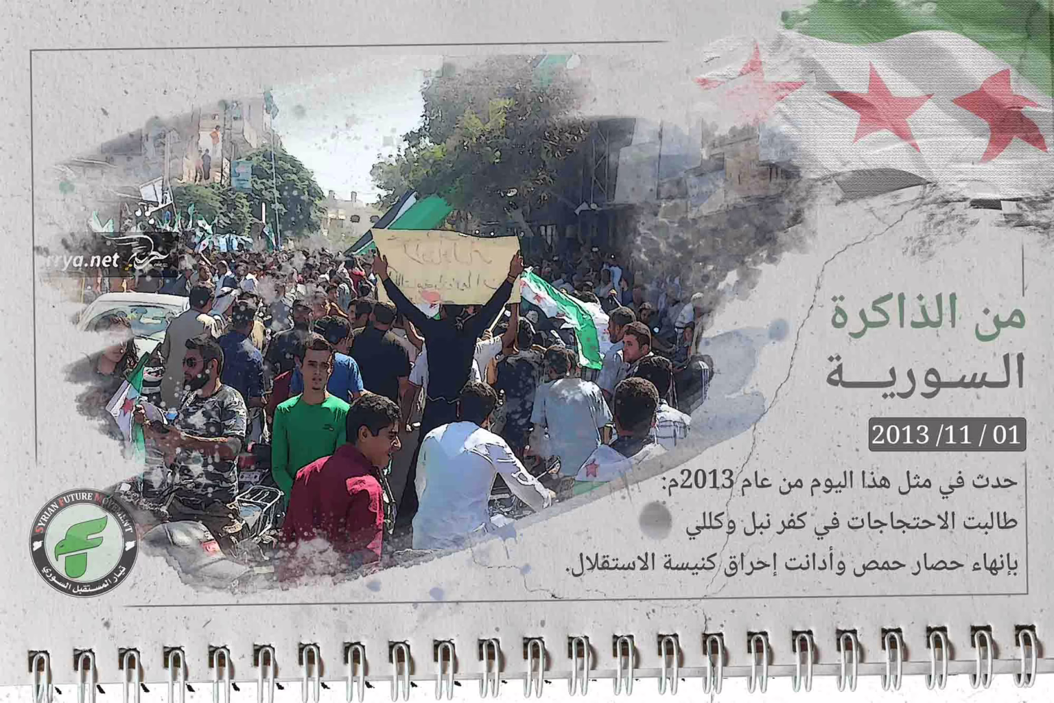 حدث في مثل هذا اليوم من عام 2013م: خرجت مظاهرات في كفرنبل وكللي بمحافظة إدلب في "جمعة الحصار جريمة إبادة مستمرة"، طالبت برفع الحصار عن مدينة حمص ومدن وبلدات ريف دمشق المحاصرة، ورفع المتظاهرون في كفرنبل لافتات منددة بهدم وإحراق كنيسة الاستقلال في تل أبيض قبل أيام.
