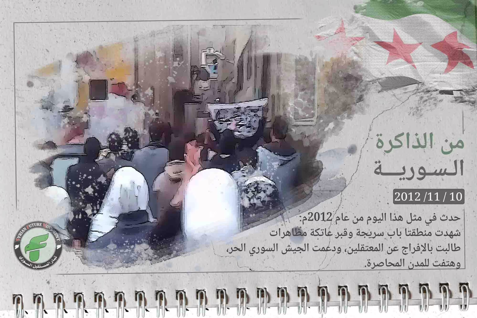 حدث في مثل هذا اليوم من عام 2012: خرجت مظاهرة نهارية في باب سريجة قرب مدرسة زنوبيا بالقرب من فرع الحزب، وأخرى في حارات قبر عاتكة، حيث سار العشرات من شباب وشابات تنسيقيات دمشق وهم يهتفون "بالحق بالدين.. بدنا المعتقلين" و"شدي حيلك يا بلد.. ونحنا رجالك يا بلد.. وما منحبك يا أسد"، كما أشادوا بحي التضامن وحيَّوا الجيش الحر فيه، وهتفوا للمدن والمناطق المحاصرة في دمشق وريفها وسائر أنحاء سورية.