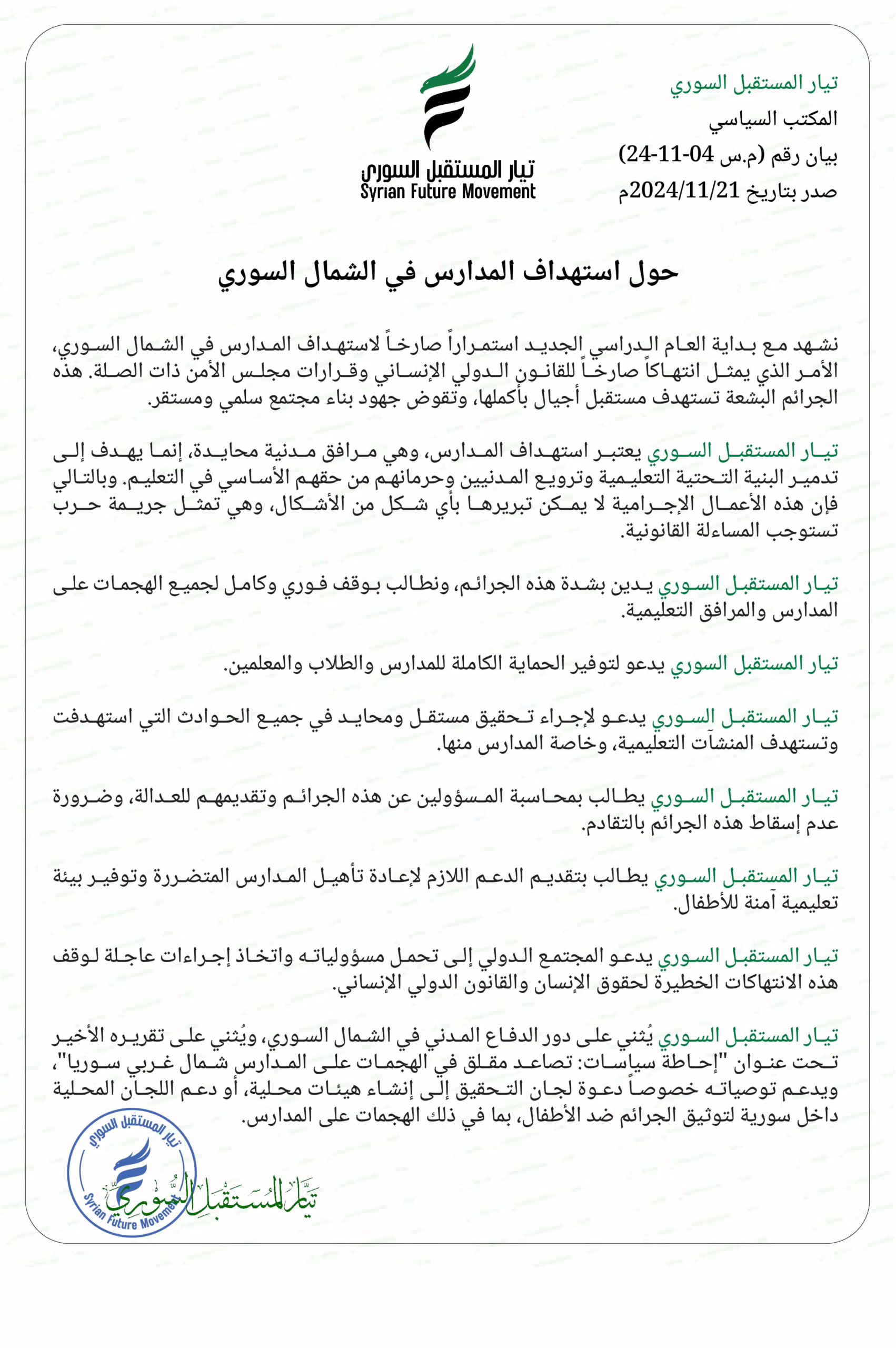 تيار المستقبل السوري يدين بشدة هذه الجرائم، ونطالب بوقف فوري وكامل لجميع الهجمات على المدارس والمرافق التعليمية.