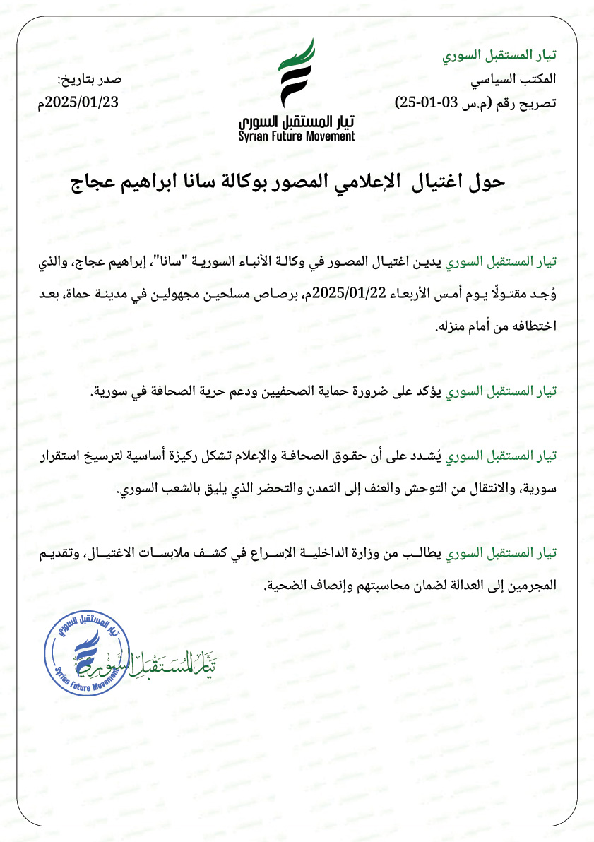 تيار المستقبل السوري يدين اغتيال المصور في وكالة الأنباء السورية "سانا"، إبراهيم عجاج، والذي وُجد مقتولًا يوم أمس الأربعاء ٢٢/١/٢٠٢٥م، برصاص مسلحين مجهولين في مدينة حماة، بعد اختطافه من أمام منزله.