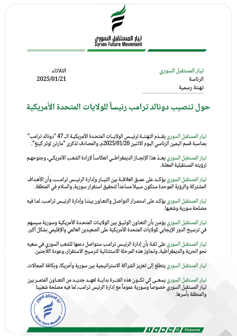 تيار المستقبل السوري على ثقة بأن إدارة الرئيس ترامب ستواصل دعمها للشعب السوري في سعيه نحو الحرية والديمقراطية، وتجاوز هذه المرحلة الاستثنائية لترسيخ الاستقرار، وعودة اللاجئين.