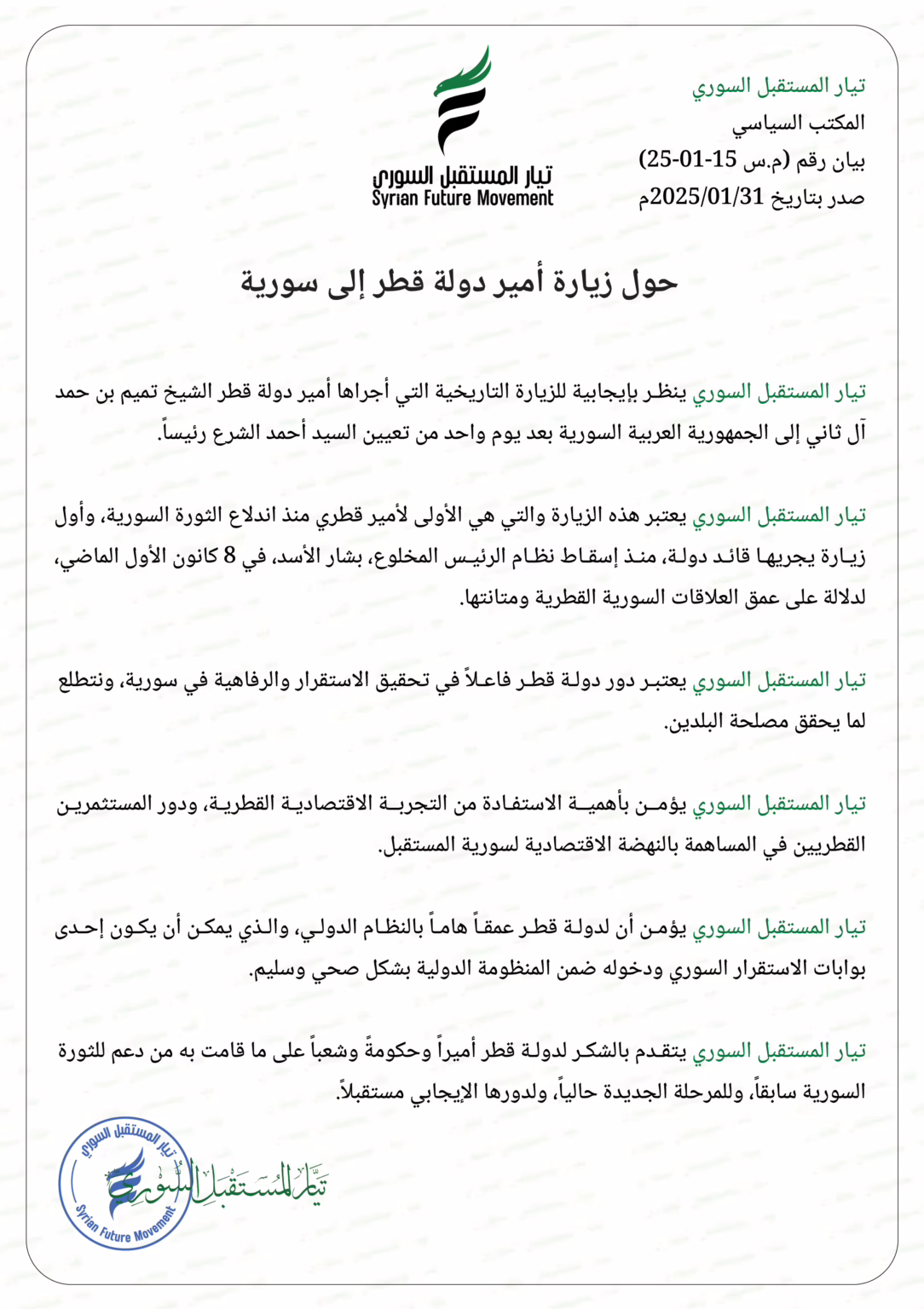 تيار المستقبل السوري ينظر بإيجابية للزيارة التاريخية التي أجراها أمير دولة قطر الشيخ تميم بن حمد آل ثاني إلى الجمهورية العربية السورية بعد يوم واحد من تعيين السيد أحمد الشرع رئيساً.