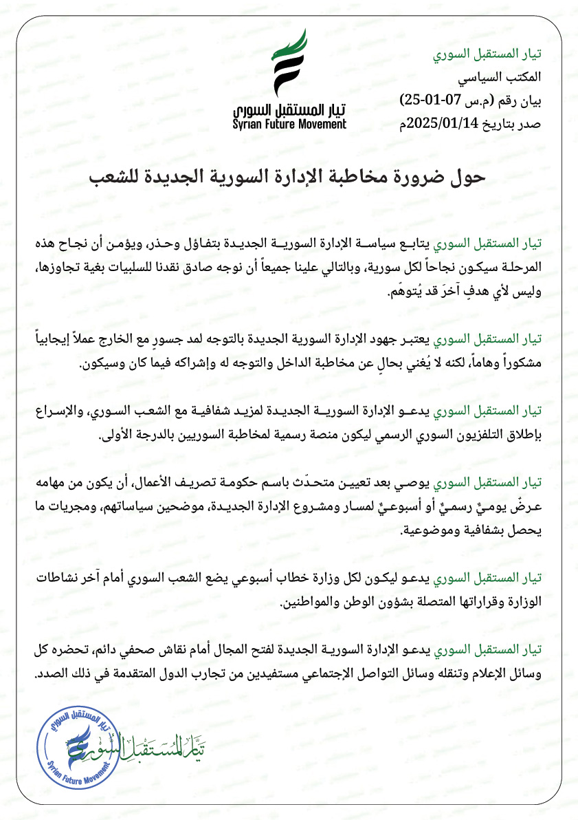 تيار المستقبل السوري يعتبر جهود الإدارة السورية الجديدة بالتوجه لمد جسورٍ مع الخارج عملاً إيجابياً مشكوراً وهاماً، لكنه لا يُغني بحالٍ عن مخاطبة الداخل والتوجه له وإشراكه فيما كان وسيكون.