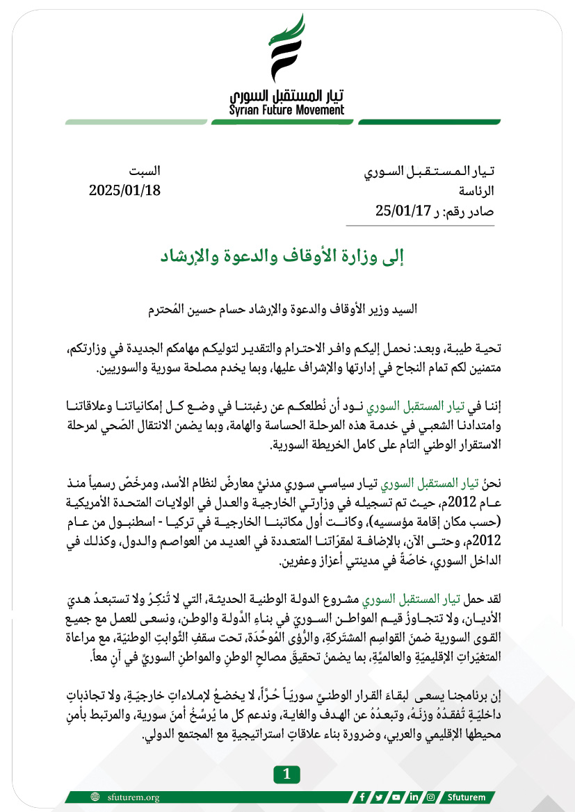 تحيـة طيبـة، وبعـد: نحمـل إليكـم وافـر الاحتـرام والتقديـر لتوليكـم مهامكم الجديدة في وزارتكم، متمنين لكم تمام النجاح في إدارتها والإشراف عليها، وبما يخدم مصلحة سورية والسوريين.