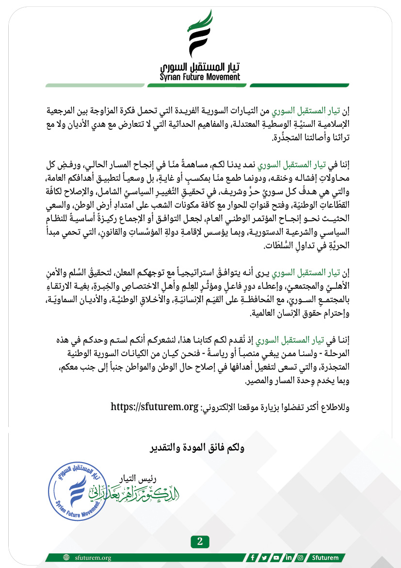 إننـا في تيار المستقبل السوري نــود أن نُطلعكــم عن رغبتنــا في وضــع كــل إمكانياتنــا وعلاقاتنــا وامتدادنـا الشعبـي في خدمـة هذه المرحلـة الحساسة والهامة، وبما يضمن الانتقال الصّحي لمرحلة الاستقرار الوطني التام على كامل الخريطة السورية.