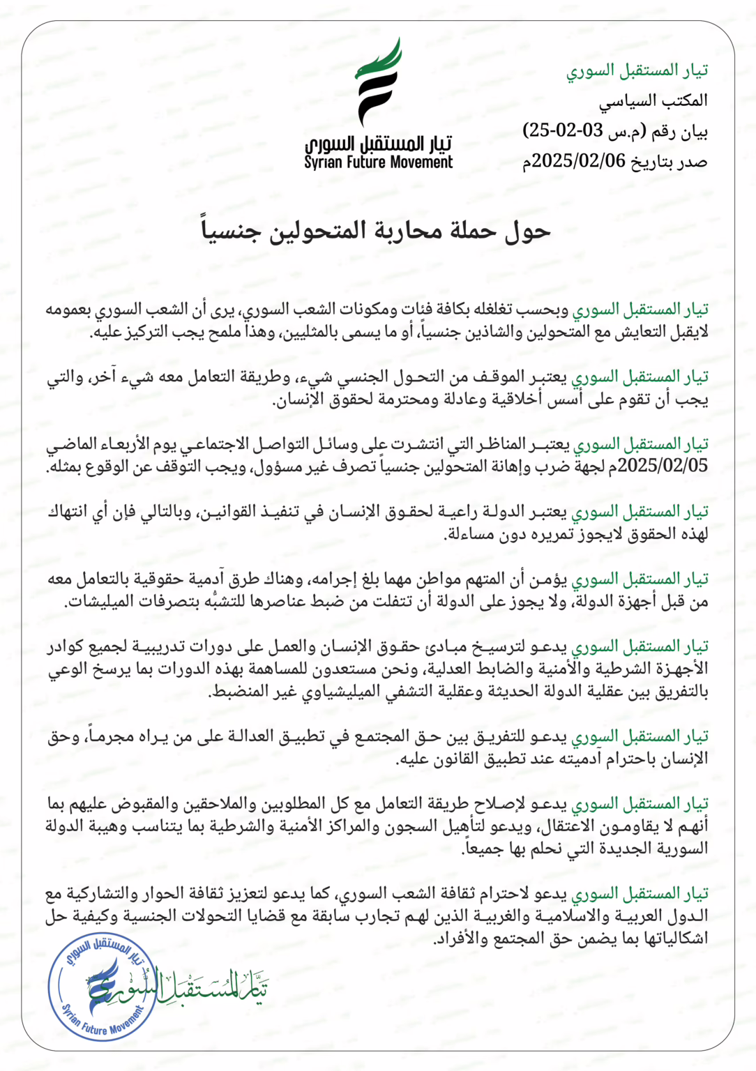 تيار المستقبل السوري يعتبر المناظر التي انتشرت على وسائل التواصل الاجتماعي يوم الأربعاء الماضي ٥/٢/٢٩٢٥م لجهة ضرب وإهانة المتحولين جنسياً تصرف غير مسؤول، ويجب التوقف عن الوقوع بمثله.