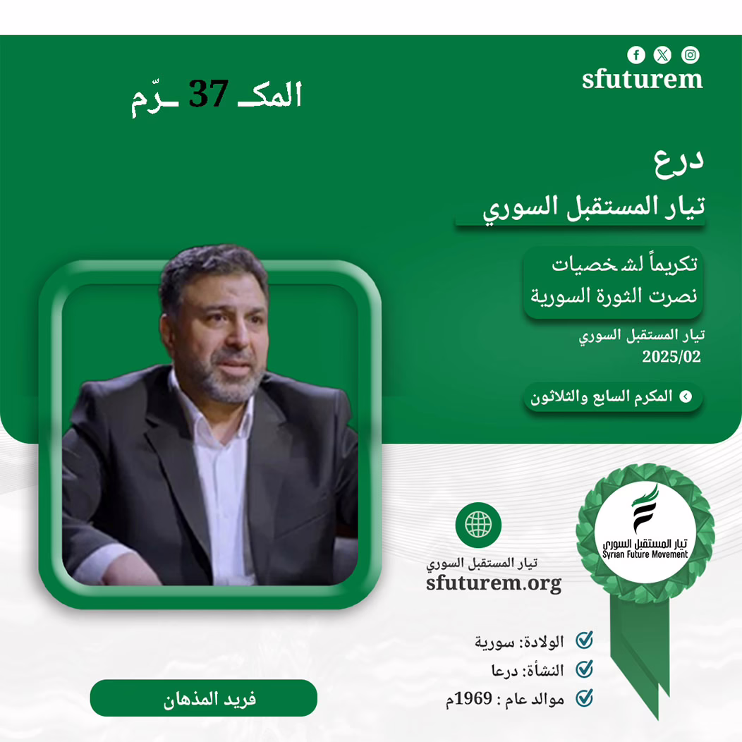 إننا في تيار المستقبل السوري، ولأجل جهده الاستثنائي والمؤثر في مسار الثورة السورية، ولوقوفه مع أبناء شعبه بثورتهم ضد الظلم والطغيان، وعرفاناً منّا بالجميل لقامات سورية ورجالاته العظماء، فإننا نقدّم درع تيار المستقبل السوري هذا الأسبوع لـِ قيصر سورية المعاصر "فريد ندى المذهان" درعاً سورية رمزيَّاً يحمل رؤيتنا ومنهجنا الوطنيَّ الجامع، داعين الدولة السورية الجديدة تخليدَ اسمه، وتكريمه بما يستحق باعتباره رمزاً وطنياً سورياً.