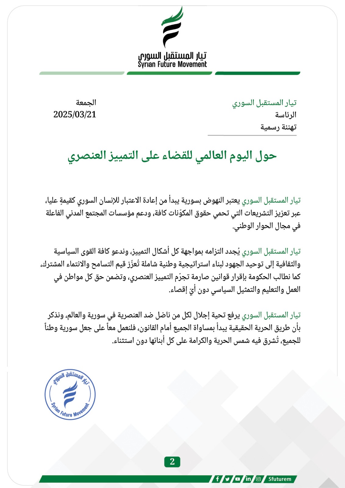 تيار المستقبل السوري يُجدد التزامه بمواجهة كل أشكال التمييز، وندعو كافة القوى السياسية والثقافية إلى توحيد الجهود لبناء استراتيجية وطنية شاملة تُعزّز قيم التسامح والانتماء المشترك، كما نطالب الحكومة بإقرار قوانين صارمة تجرّم التمييز العنصري، وتضمن حق كل مواطن في العمل والتعليم والتمثيل السياسي دون أيّ إقصاء.