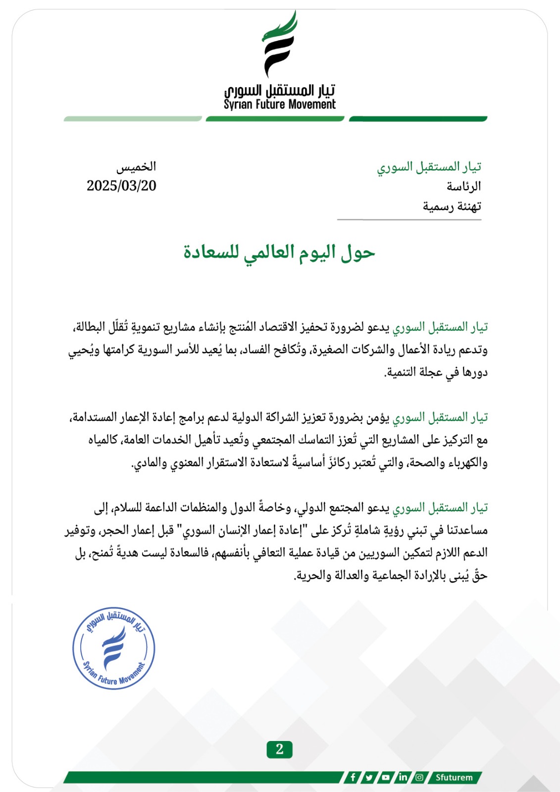تيار المستقبل السوري يدعو لإدماج مفهوم السعادة في السياسات الوطنية عبر تبني استراتيجياتٍ تُعزز العدالة الاجتماعية، وتضمن الحقوق الأساسية في الصحة والتعليم والعمل اللائق، وتُعيد تأهيل البنى النفسية للمجتمع عبر برامج دعم نفسي واجتماعي شاملة.