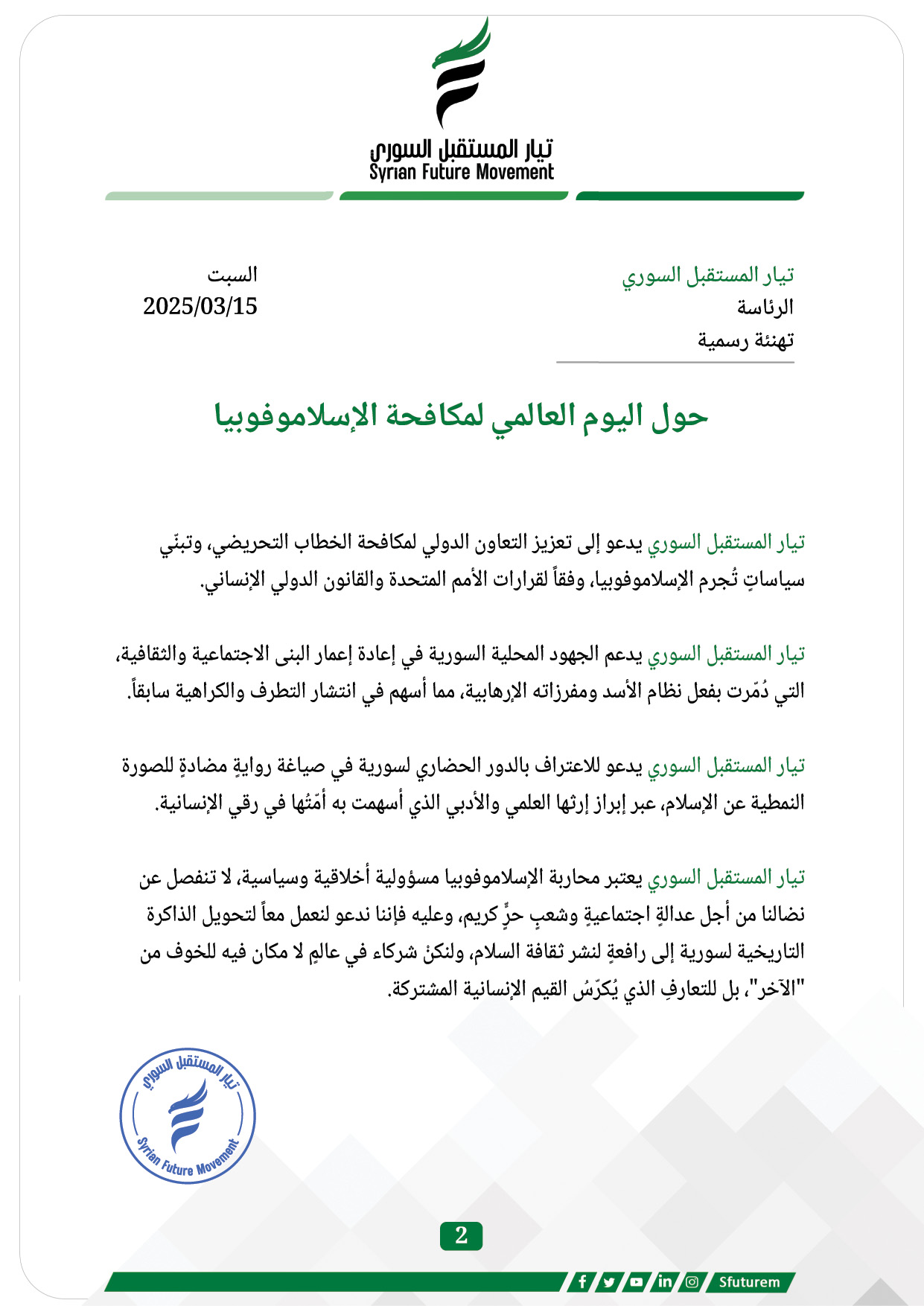 تيار المستقبل السوري يعتبر محاربة الإسلاموفوبيا مسؤولية أخلاقية وسياسية، لا تنفصل عن نضالنا من أجل عدالةٍ اجتماعيةٍ وشعبٍ حرٍٍّ كريم، وعليه فإننا ندعو لنعمل معاً لتحويل الذاكرة التاريخية لسورية إلى رافعةٍ لنشر ثقافة السلام، ولنكنْ شركاء في عالمٍ لا مكان فيه للخوف من "الآخر"، بل للتعارفِ الذي يُكرّسُ القيم الإنسانية المشتركة.