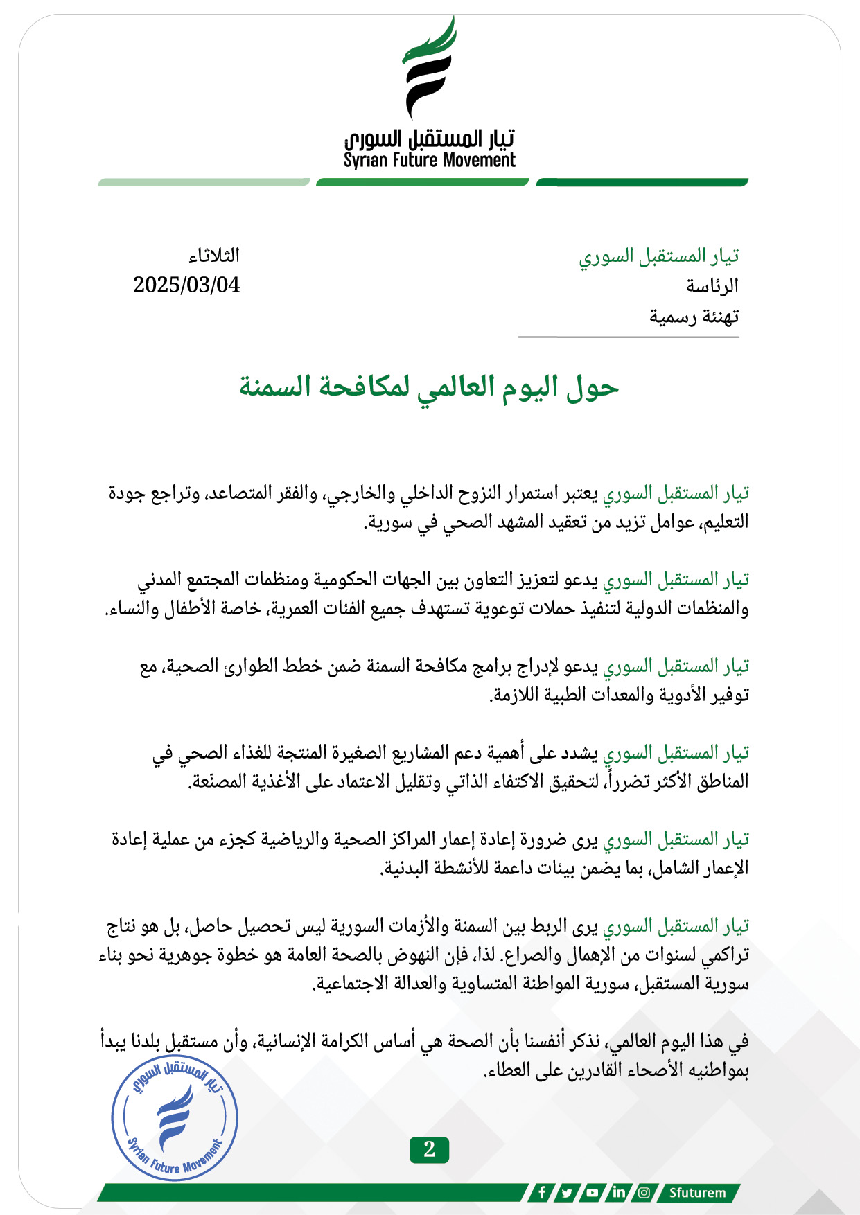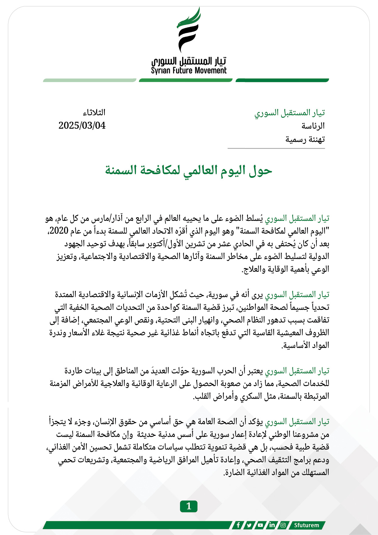 تيار المستقبل السوري يؤكد أن الصحة العامة هي حق أساسي من حقوق الإنسان، وجزء لا يتجزأ من مشروعنا الوطني لإعادة إعمار سورية على أسس مدنية حديثة وإن مكافحة السمنة ليست قضية طبية فحسب، بل هي قضية تنموية تتطلب سياسات متكاملة تشمل تحسين الأمن الغذائي، ودعم برامج التثقيف الصحي، وإعادة تأهيل المرافق الرياضية والمجتمعية، وتشريعات تحمي المستهلك من المواد الغذائية الضارة.